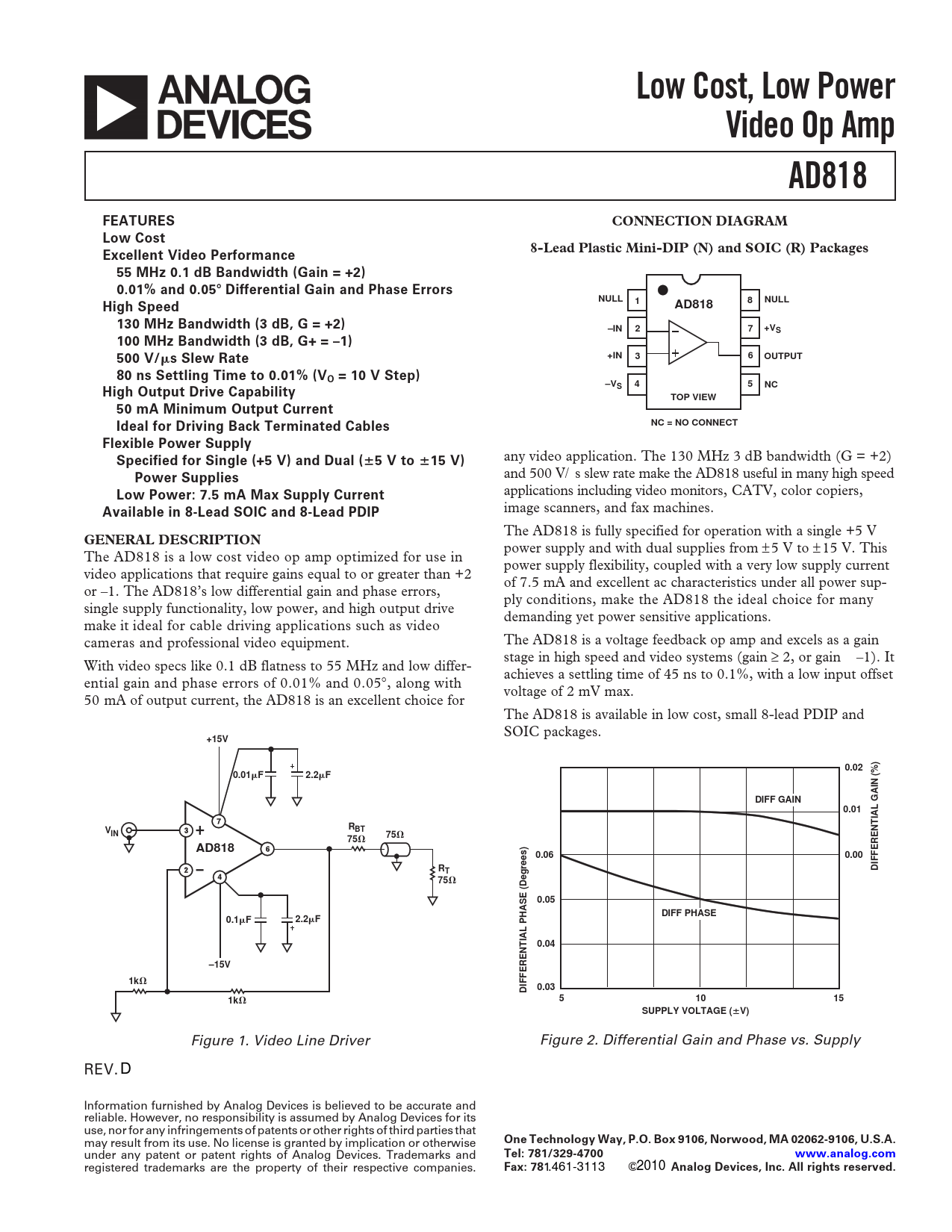 Low Cost, Low Power Video Op Amp AD818 FEATURES CONNECTION DIAGRAM Low Cost 8-Lead Plastic Mini-DIP (N) and SOIC (R) Packages Excellent Video Performance 55 MHz 0.1 dB Bandwidth (Gain = +2) 0.01% and 0.05