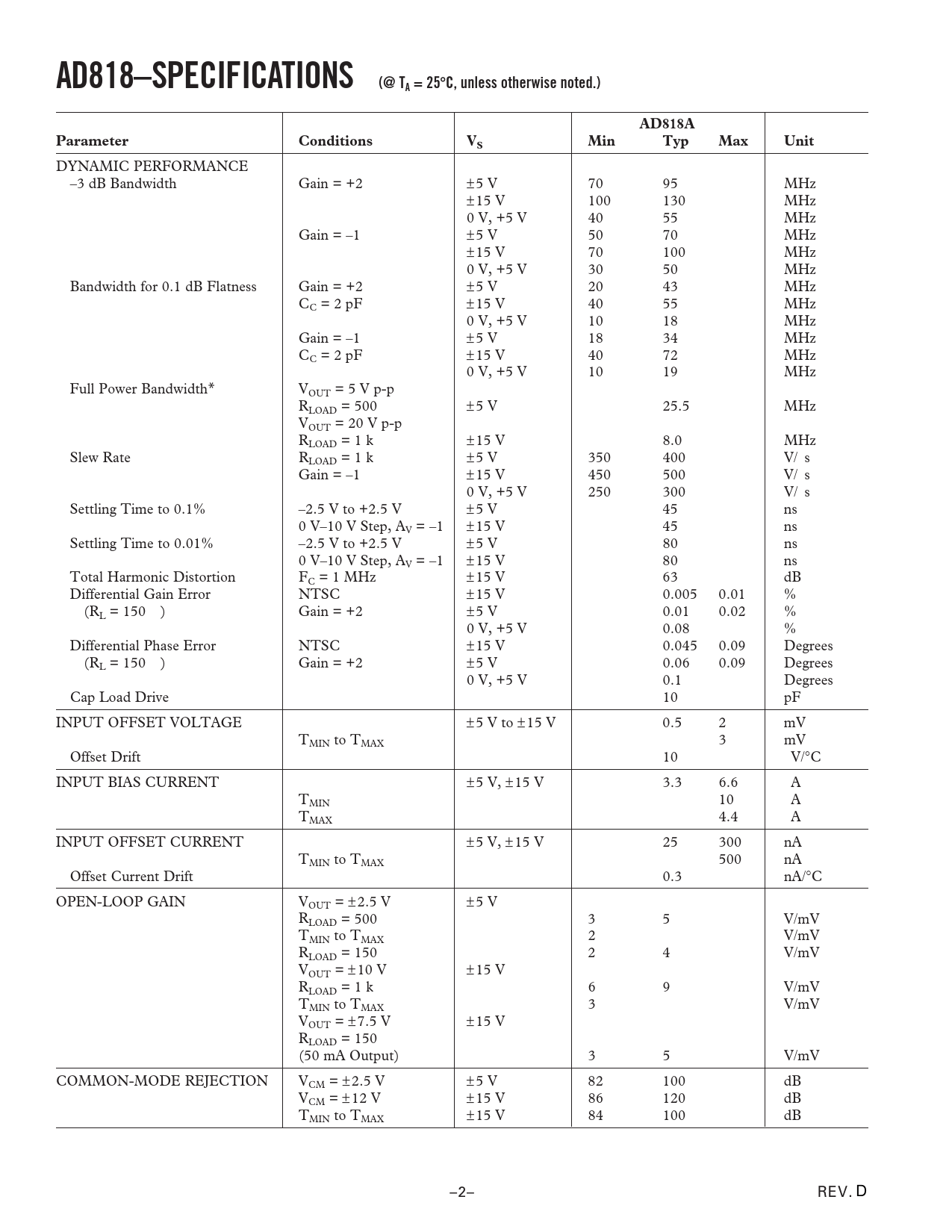AD818–SPECIFICATIONS (@ TA = 25 C, unless otherwise noted.) AD818A Parameter Conditions Min Typ Max Unit