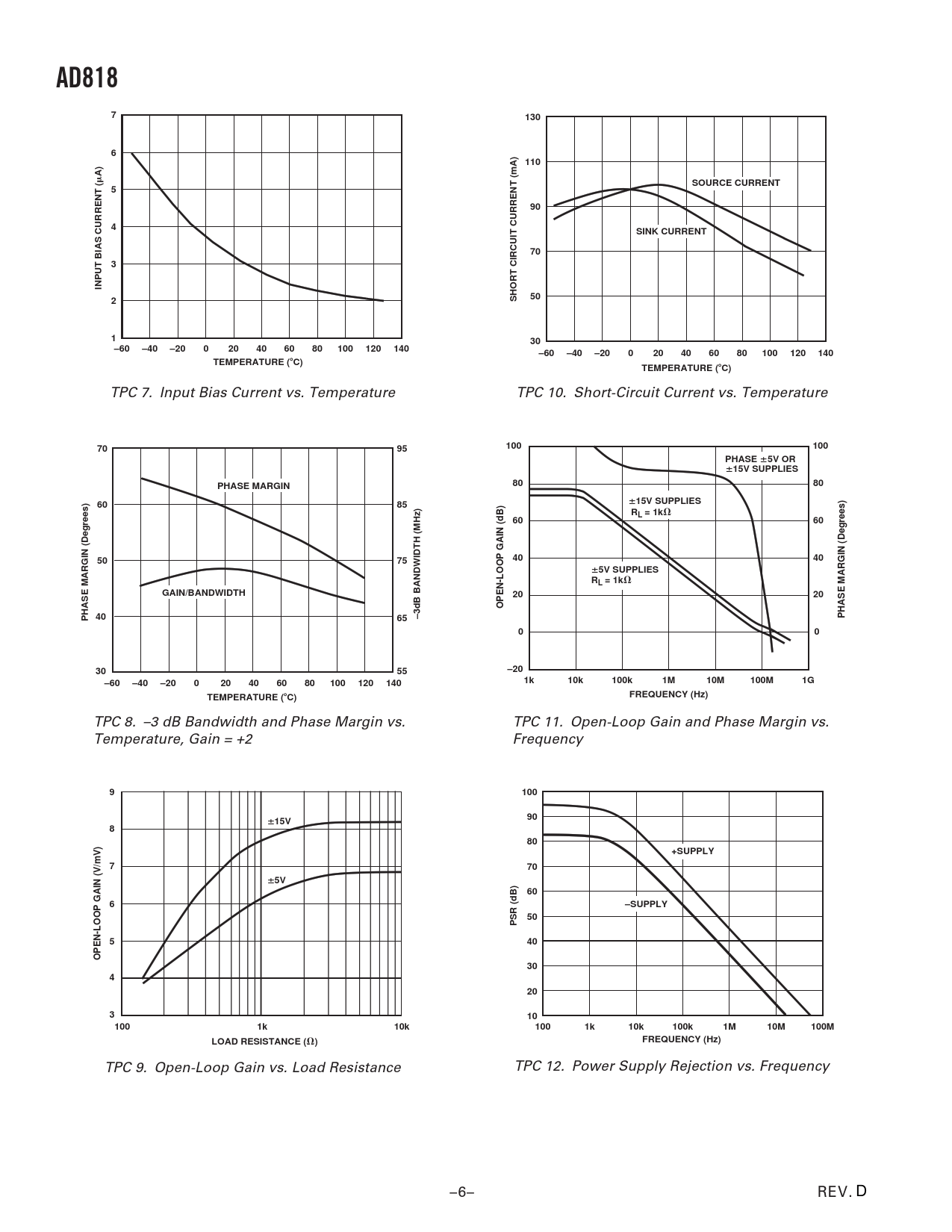 AD818. 130. 110. SOURCE CURRENT. SINK CURRENT. INPUT BIAS CURRENT (. SHORT CIRCUIT CURRENT (mA). –60. –40. –20. 100. 120. 140. TEMPERATURE (. PHASE