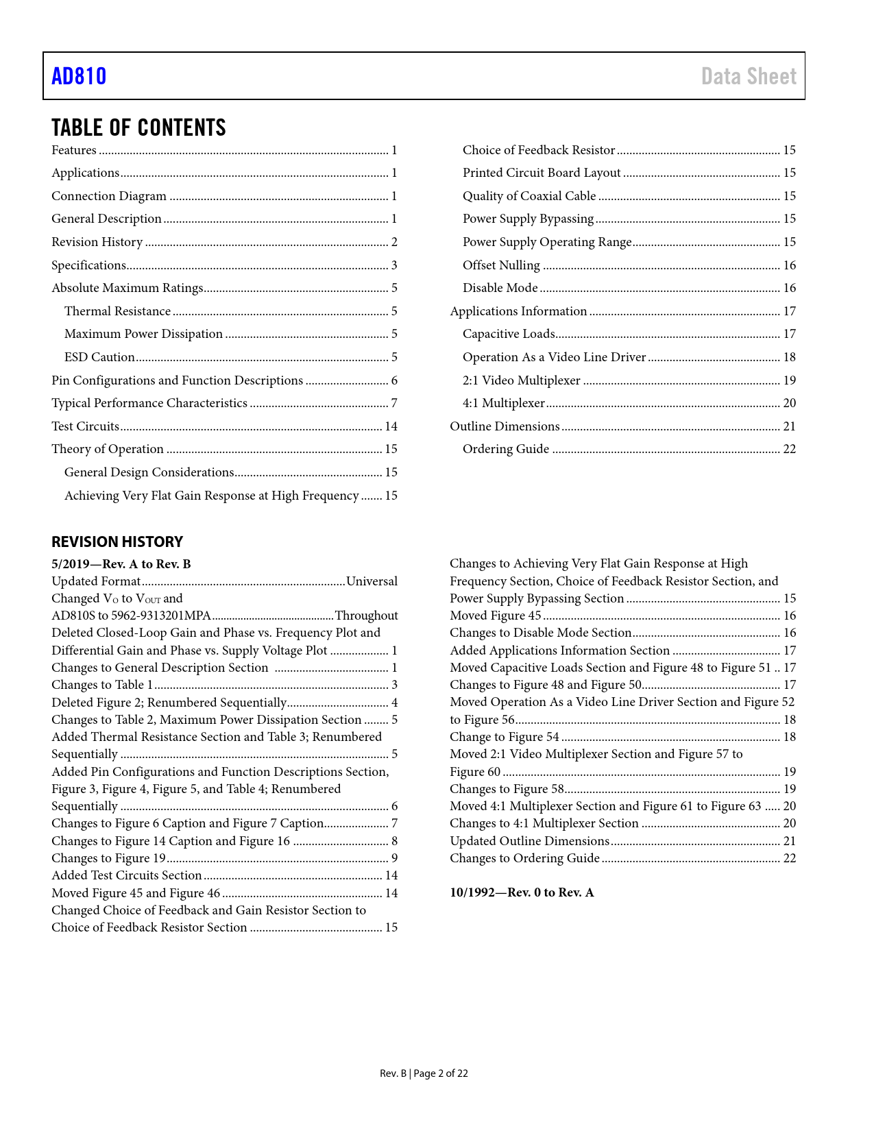AD810 Data Sheet TABLE OF CONTENTS