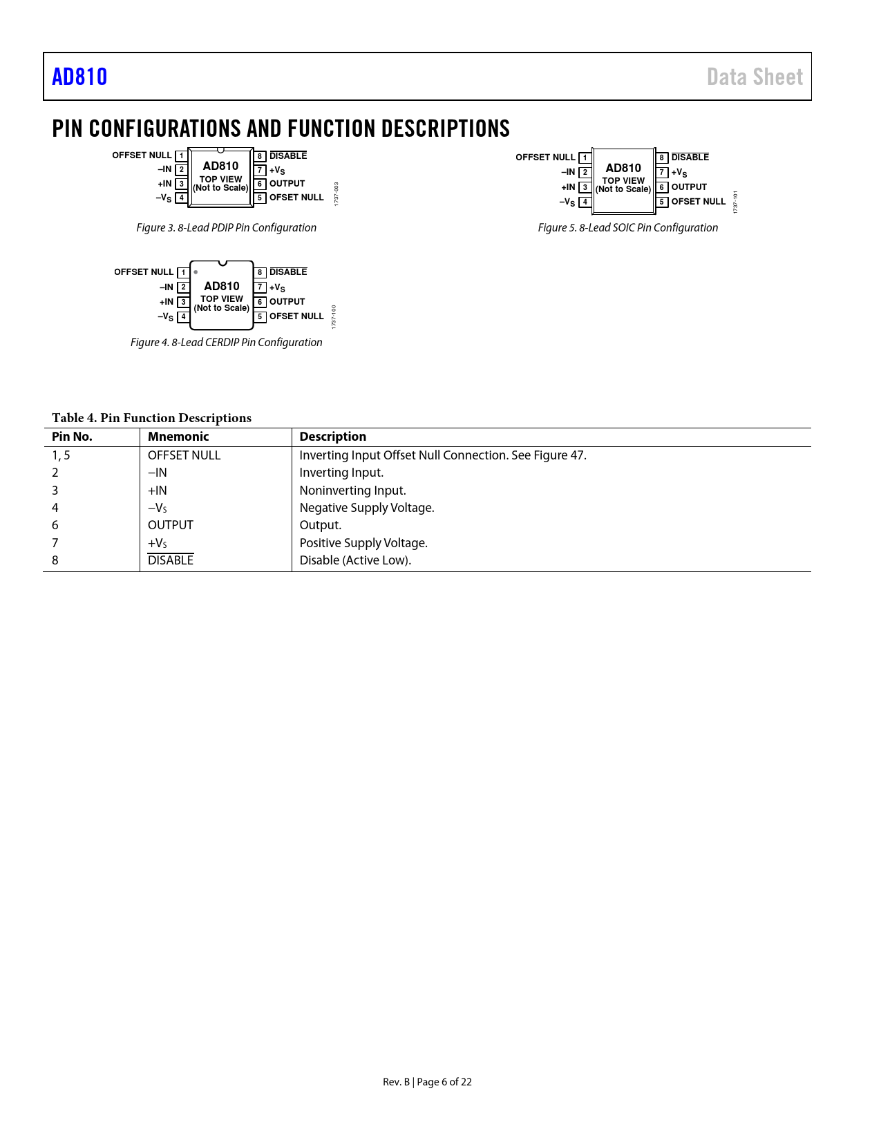 AD810 Data Sheet PIN CONFIGURATIONS AND FUNCTION DESCRIPTIONS OFFSET NULL 1 8 DISABLE OFFSET NULL 1 8 DISABLE –IN AD810 2 7 +V AD810 S –IN 2 7 +VS +IN TOP VIEW 3 6 OUTPUT TOP VIEW (Not to Scale)