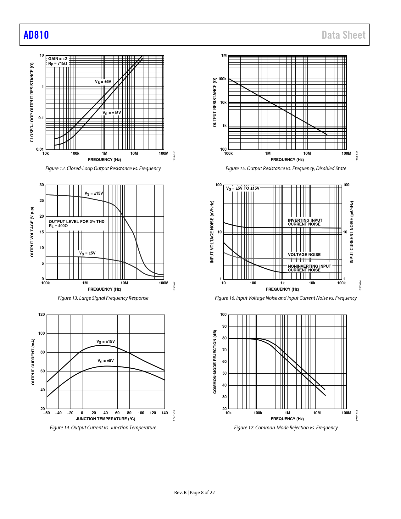AD810Data Sheet101MGAIN = +2)RF = 715ΩE (Ω C N)TA100kVS = ±5V1E (ΩESISC NT RTAU TP10kESISOUVT RS = ±15VU0.1TP-LOOPOU1kED LOS C0.0110010k100k1M10M100M 010 100k1M10M100M 013 FREQUENCY (Hz) 1737- FREQUENCY (Hz) 1737- Figure 12. Closed-Loop Output Resistance vs. Frequency Figure 15. Output Resistance vs. Frequency, Disabled State 30100100VS = ±5V TO ±15VVS = ±15V25z))Hp)/√√Hzp- V20(E (nVOUTPUT LEVEL FOR 3% THDINVERTING INPUT CURRENT NOISEISE (pA/GERL = 400ΩOIS NNO151010OLTAGENTT V U10OLTATPCURREVT VOUS = ±5VVOLTAGE NOISEPUUT5ININPNONINVERTING INPUT CURRENT NOISE011100k1M10M100M 011 101001k10k100k 014 FREQUENCY (Hz) 1737- FREQUENCY (Hz) 1737- Figure 13. Large Signal Frequency Response Figure 16. Input Voltage Noise and Input Current Noise vs. Frequency 12010090100B) d80VN (S = ±15VmA)IO(CT70NT80JEVS = ±5VRE60CURREDE60OUTM50PN-UTOOM40M40CO302020–60–40–20020406080100120140 012 10k100k1M10M100M 015 JUNCTION TEMPERATURE (°C) 1737- FREQUENCY (Hz) 1737- Figure 14. Output Current vs. Junction Temperature Figure 17. Common-Mode Rejection vs. Frequency Rev. B | Page 8 of 22 Document Outline FEATURES APPLICATIONS CONNECTION DIAGRAM GENERAL DESCRIPTION TABLE OF CONTENTS REVISION HISTORY SPECIFICATIONS ABSOLUTE MAXIMUM RATINGS THERMAL RESISTANCE MAXIMUM POWER DISSIPATION ESD CAUTION PIN CONFIGURATIONS AND FUNCTION DESCRIPTIONS TYPICAL PERFORMANCE CHARACTERISTICS TEST CIRCUITS THEORY OF OPERATION GENERAL DESIGN CONSIDERATIONS ACHIEVING VERY FLAT GAIN RESPONSE AT HIGH FREQUENCY CHOICE OF FEEDBACK RESISTOR PRINTED CIRCUIT BOARD LAYOUT QUALITY OF COAXIAL CABLE POWER SUPPLY BYPASSING POWER SUPPLY OPERATING RANGE OFFSET NULLING DISABLE MODE APPLICATIONS INFORMATION CAPACITIVE LOADS OPERATION AS A VIDEO LINE DRIVER 2:1 VIDEO MULTIPLEXER 4:1 MULTIPLEXER OUTLINE DIMENSIONS ORDERING GUIDE