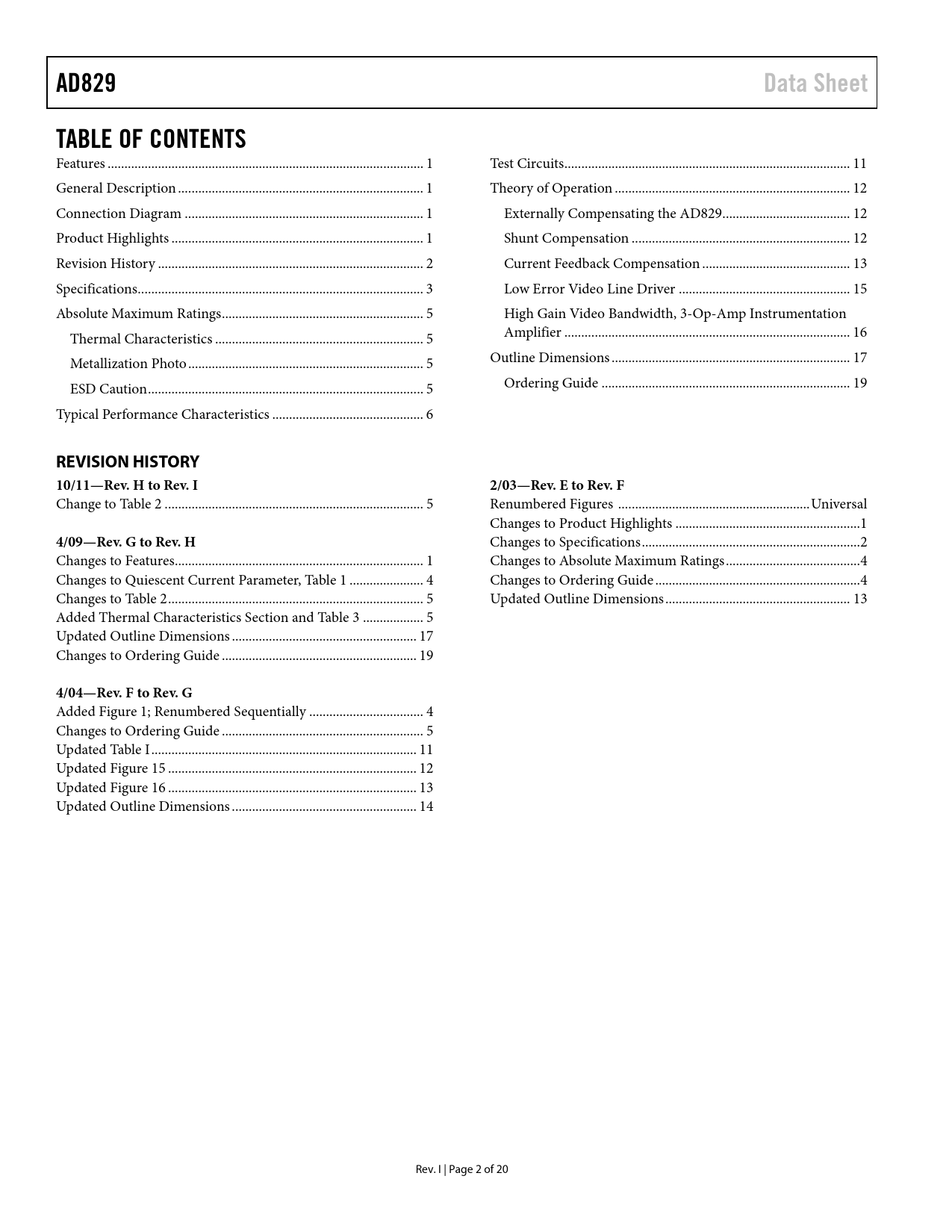 Seiten / Seite20 / 2 — AD829. Data Sheet. TABLE OF CONTENTS. REVISION HISTORY 10/11—Rev. H to …