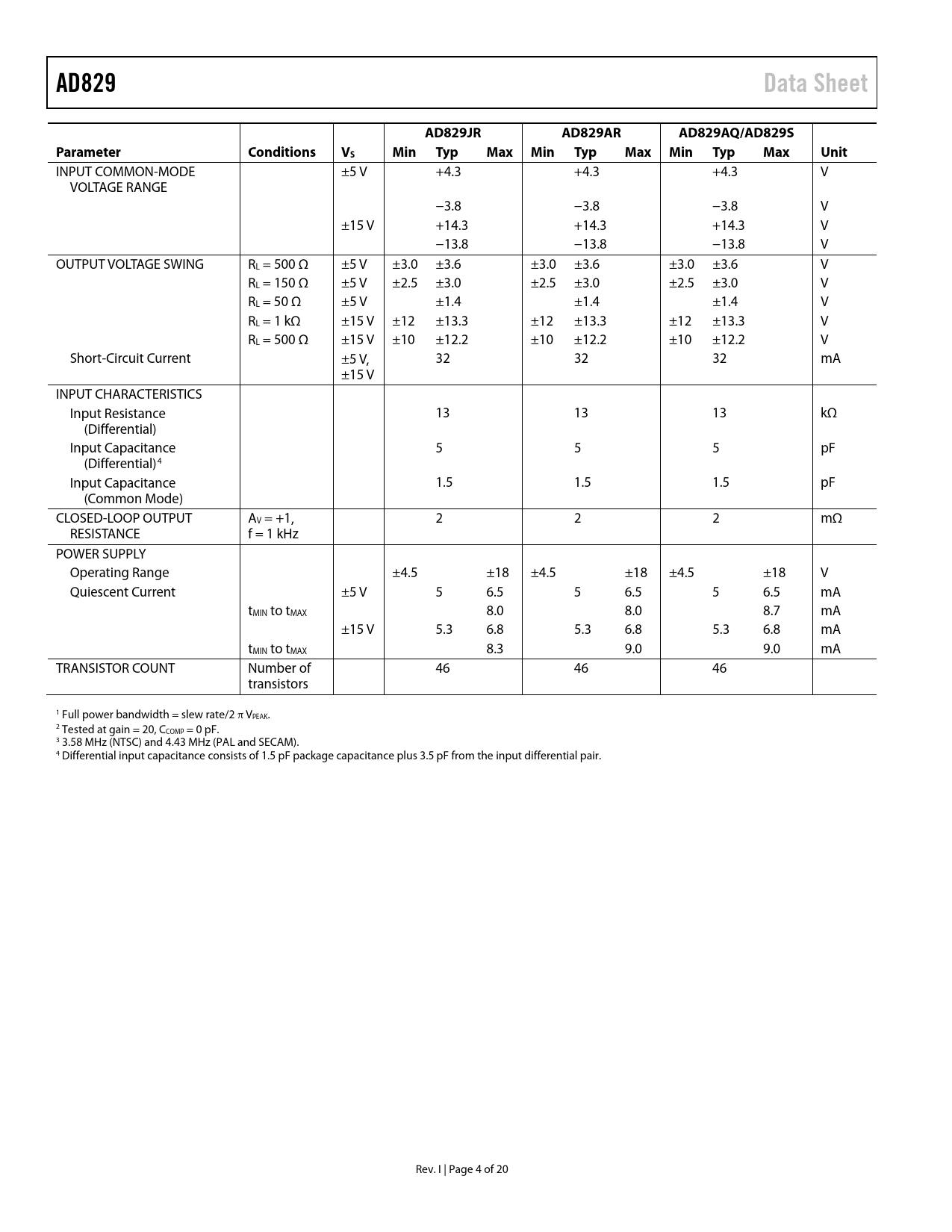 Seiten / Seite20 / 4 — AD829. Data Sheet. AD829JR. AD829AR. AD829AQ/AD829S. Parameter. …
