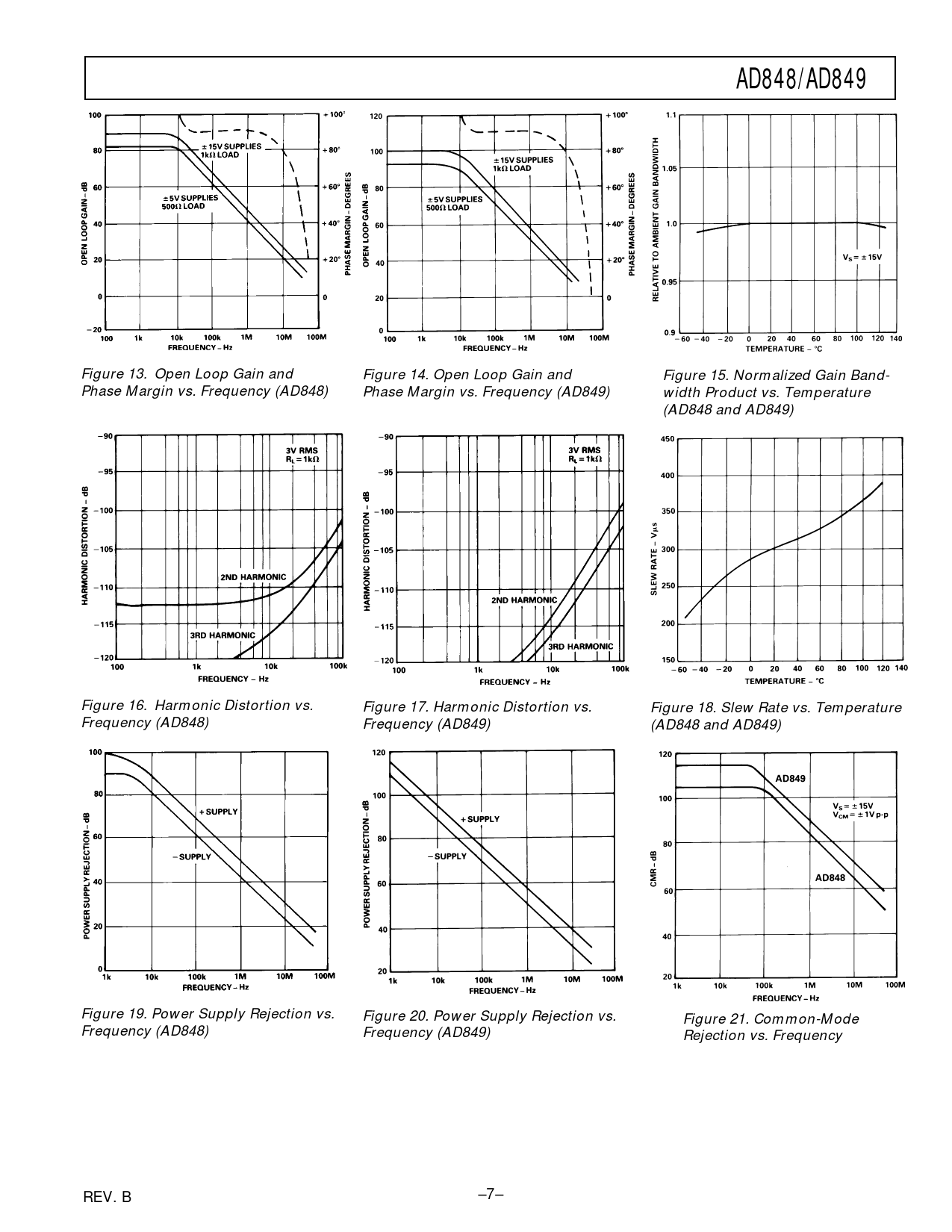 Figure 13. Open Loop Gain and Figure 14. Open Loop Gain and Figure 15. Normalized Gain Band- Phase Margin vs. Frequency (AD848) Phase Margin vs. Frequency (AD849) width Product vs. Temperature (AD848 and AD849) Figure 16. Harmonic Distortion vs. Figure 17. Harmonic Distortion vs. Figure 18. Slew Rate vs. Temperature Frequency (AD848) Frequency (AD849) (AD848 and AD849) Figure 19. Power Supply Rejection vs. Figure 20. Power Supply Rejection vs. Figure 21. Common-Mode Frequency (AD848) Frequency (AD849) Rejection vs. Frequency REV. B –7–