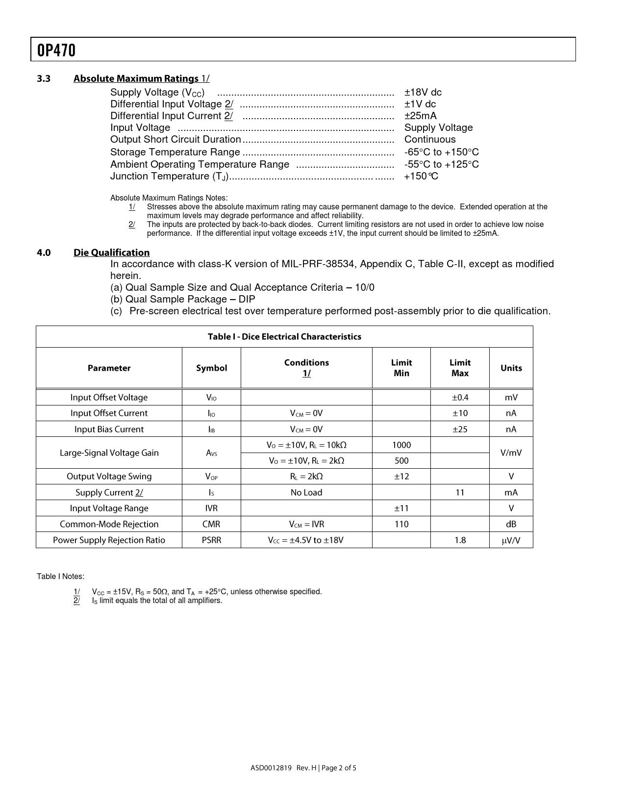 Supply Voltage (VCC) ... ±18V dc Differential Input Voltage 2/ ... ±1V dc Differential Input Current 2/ .. ±25mA Input Voltage ... Supply Voltage Output Short Circuit Duration .. Continuous Storage Temperature Range .. -65C to +150C Ambient Operating Temperature Range ... -55C to +125C Junction Temperature (TJ)... ... +150°C Absolute Maximum Ratings Notes: 1/ Stresses above the absolute maximum rating may cause permanent damage to the device. Extended operation at the maximum levels may degrade performance and affect reliability. 2/ The inputs are protected by back-to-back diodes. Current limiting resistors are not used in order to achieve low noise performance. If the differential input voltage exceeds ±1V, the input current should be limited to ±25mA. In accordance with class-K version of MIL-PRF-38534, Appendix C, Table C-II, except as modified herein. (a) Qual Sample Size and Qual Acceptance Criteria – 10/0 (b) Qual Sample Package – DIP (c) Pre-screen electrical test over temperature performed post-assembly prior to die qualification.  Table I Notes: 1/ VCC = ±15V, RS = 50, and TA = +25C, unless otherwise specified. 2/ IS limit equals the total of all amplifiers.