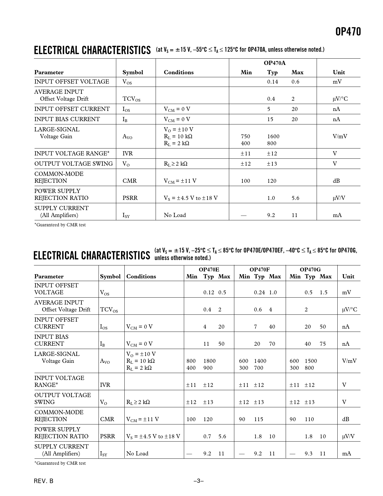 OP470 (at VS = 15 V, –55 125 C for OP470A, unless otherwise noted.) ELECTRICAL CHARACTERISTICS OP470A Parameter Symbol