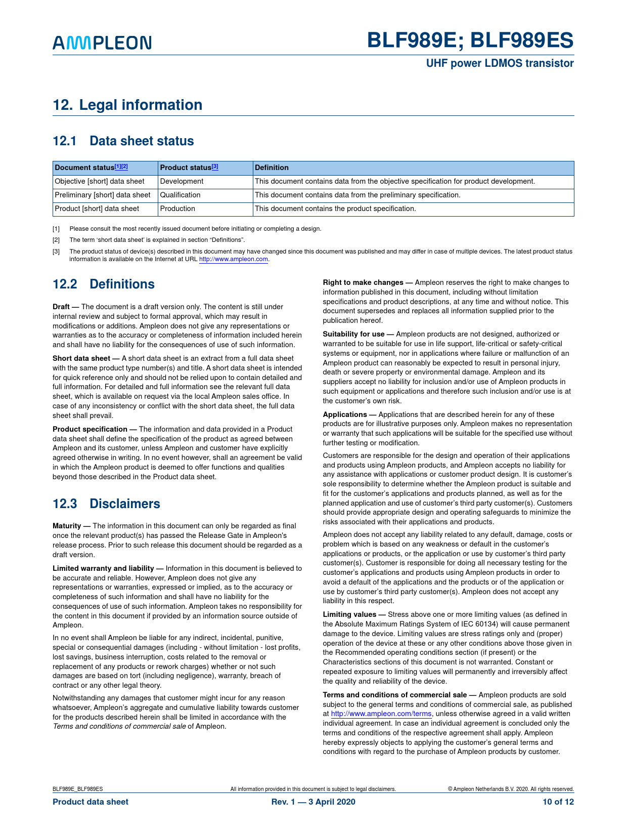 | Seiten / Seite | 12 / 10 — BLF989E; BLF989ES. UHF power LDMOS transistor. 12. Legal information. … |