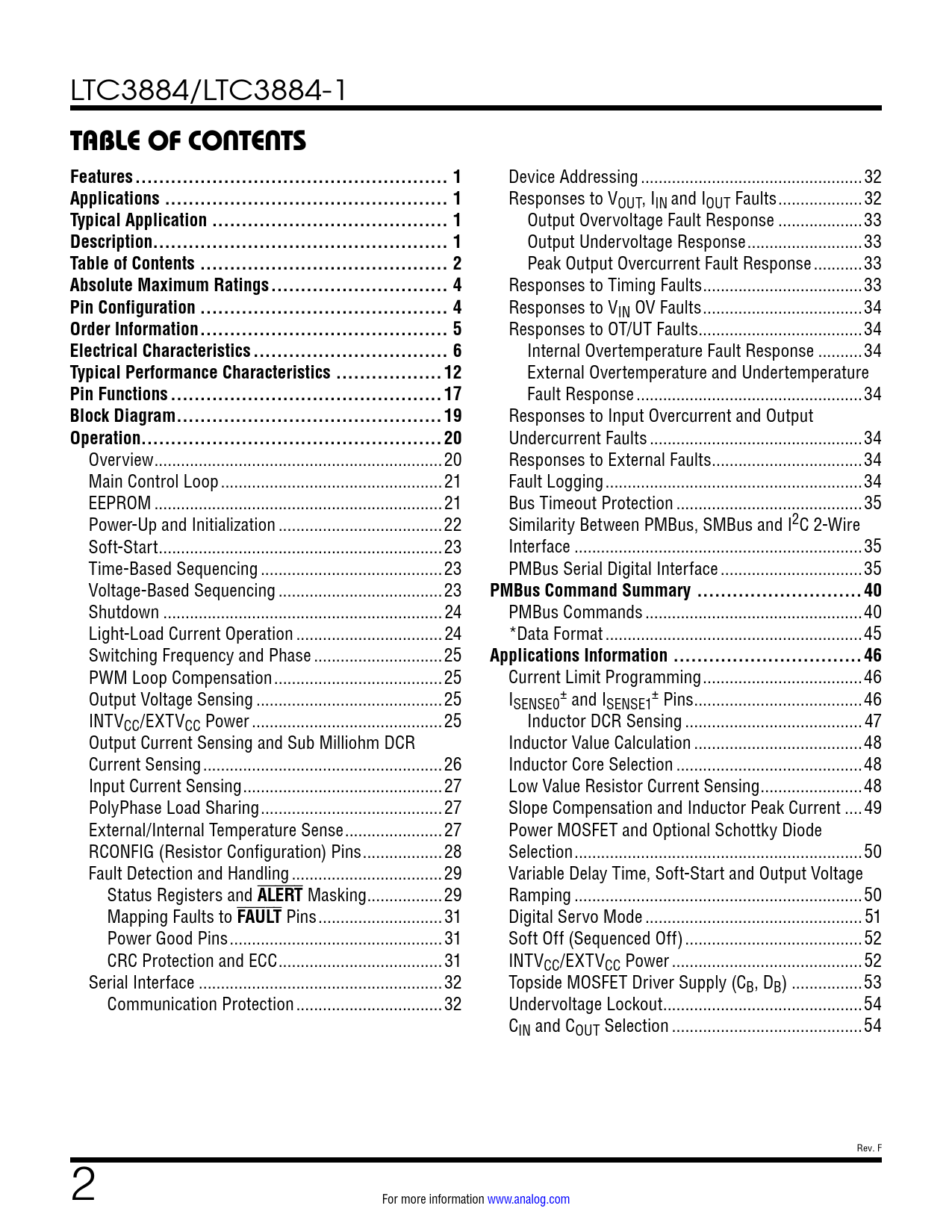 link to page 1 link to page 1 link to page 1 link to page 1 link to page 2 link to page 4 link to page 4 link to page 5 link to page 6 link to page 12 link to page 17 link to page 19 link to page 20 link to page 20 link to page 21 link to page 21 link to page 22 link to page 23 link to page 23 link to page 23 link to page 24 link to page 24 link to page 25 link to page 25 link to page 25 link to page 25 link to page 26 link to page 26 link to page 27 link to page 27 link to page 27 link to page 28 link to page 29 link to page 29 link to page 31 link to page 31 link to page 31 link to page 32 link to page 32 link to page 32 link to page 32 link to page 33 link to page 33 link to page 33 link to page 33 link to page 34 link to page 34 link to page 34 link to page 34 link to page 34 link to page 34 link to page 34 link to page 34 link to page 34 link to page 35 link to page 35 link to page 35 link to page 35 link to page 40 link to page 40 link to page 45 link to page 46 link to page 46 link to page 46 link to page 47 link to page 48 link to page 48 link to page 48 link to page 49 link to page 50 link to page 50 link to page 50 link to page 50 link to page 51 link to page 52 link to page 52 link to page 53 link to page 54 link to page 54 LTC3884/LTC3884-1 TABLE OF CONTENTS Features ... 1 Device Addressing ..32 Applications .. 1 Responses to VOUT, IIN and IOUT Faults ...32 Typical Application .. 1 Output Overvoltage Fault Response ...33 Description.. 1 Output Undervoltage Response ..33 Table of Contents .. 2 Peak Output Overcurrent Fault Response ...33 Absolute Maximum Ratings .. 4 Responses to Timing Faults ..33 Pin Configuration .. 4 Responses to VIN OV Faults ..34 Order Information .. 5 Responses to OT/UT Faults ...34 Electrical Characteristics ... 6 Internal Overtemperature Fault Response ..34 Typical Performance Characteristics ..12 External Overtemperature and Undertemperature Pin Functions ..17 Fault Response ...34 Block Diagram ...19 Responses to Input Overcurrent and Output Operation...20 Undercurrent Faults ..34 Overview ...20 Responses to External Faults ..34 Main Control Loop ..21 Fault Logging ..34 EEPROM ...21 Bus Timeout Protection ..35 Power-Up and Initialization ...22 Similarity Between PMBus, SMBus and I2C 2-Wire Soft-Start ..23 Interface ...35 Time-Based Sequencing ...23 PMBus Serial Digital Interface ..35 Voltage-Based Sequencing ...23 PMBus Command Summary ..40 Shutdown ... 24 PMBus Commands ...40 Light-Load Current Operation ... 24 *Data Format ..45 Switching Frequency and Phase ...25 Applications Information ..46 PWM Loop Compensation ..25 Current Limit Programming ..46 Output Voltage Sensing ..25 I ± ± SENSE0 and ISENSE1 Pins ..46 INTVCC/EXTVCC Power ...25 Inductor DCR Sensing ..47 Output Current Sensing and Sub Mil iohm DCR Inductor Value Calculation ..48 Current Sensing ..26 Inductor Core Selection ..48 Input Current Sensing ...27 Low Value Resistor Current Sensing ...48 PolyPhase Load Sharing ...27 Slope Compensation and Inductor Peak Current ..49 External/Internal Temperature Sense ..27 Power MOSFET and Optional Schottky Diode RCONFIG (Resistor Configuration) Pins ..28 Selection ...50 Fault Detection and Handling ..29 Variable Delay Time, Soft-Start and Output Voltage Status Registers and ALERT Masking ...29 Ramping ...50 Mapping Faults to FAULT Pins ..31 Digital Servo Mode ... 51 Power Good Pins ..31 Soft Off (Sequenced Off) ..52 CRC Protection and ECC ...31 INTVCC/EXTVCC Power ...52 Serial Interface ...32 Topside MOSFET Driver Supply (CB, DB) ..53 Communication Protection ...32 Undervoltage Lockout ...54 CIN and COUT Selection ...54 Rev. F 2 For more information www.analog.com Document Outline Features Applications Typical Application Description Table of Contents Absolute Maximum Ratings Pin Configuration Order Information Electrical Characteristics Typical Performance Characteristics Pin Functions Block Diagram Operation Overview Main Control Loop EEPROM Power-Up and Initialization Soft-Start Time-Based Sequencing Voltage-Based Sequencing Shutdown Light-Load Current Operation Switching Frequency and Phase PWM Loop Compensation Output Voltage Sensing INTVCC/EXTVCC Power Output Current Sensing and Sub Milliohm DCR Current Sensing Input Current Sensing PolyPhase Load Sharing External/Internal Temperature Sense RCONFIG (Resistor Configuration) Pins Fault Detection and Handling Status Registers and ALERT Masking Mapping Faults to FAULT Pins Power Good Pins CRC Protection and ECC Serial Interface Communication Protection Device Addressing Responses to VOUT, IIN and IOUT Faults Output Overvoltage Fault Response Output Undervoltage Response Peak Output Overcurrent Fault Response Responses to Timing Faults Responses to VIN OV Faults Responses to OT/UT Faults Internal Overtemperature Fault Response External Overtemperature and Undertemperature Fault Response Responses to Input Overcurrent and Output Undercurrent Faults Responses to External Faults Fault Logging Bus Timeout Protection Similarity Between PMBus, SMBus and I2C 2-Wire Interface PMBus Serial Digital Interface PMBus Command Summary PMBus Commands *Data Format Applications Information Current Limit Programming ISENSE0± and ISENSE1± Pins Inductor DCR Sensing Inductor Value Calculation Inductor Core Selection Low Value Resistor Current Sensing Slope Compensation and Inductor Peak Current Power MOSFET and Optional Schottky Diode Selection Variable Delay Time, Soft-Start and Output Voltage Ramping Digital Servo Mode Soft Off (Sequenced Off) INTVCC/EXTVCC Power Topside MOSFET Driver Supply (CB, DB) Undervoltage Lockout CIN and COUT Selection Fault Indication Open-Drain Pins Phase-Locked Loop and Frequency Synchronization Minimum On-Time Considerations External Temperature Sense Input Current Sense Amplifier External Resistor Configuration Pins (RCONFIG) Voltage Selection Frequency Selection Phase Selection Address Selection Using RCONFIG Efficiency Considerations Programmable Loop Compensation Checking Transient