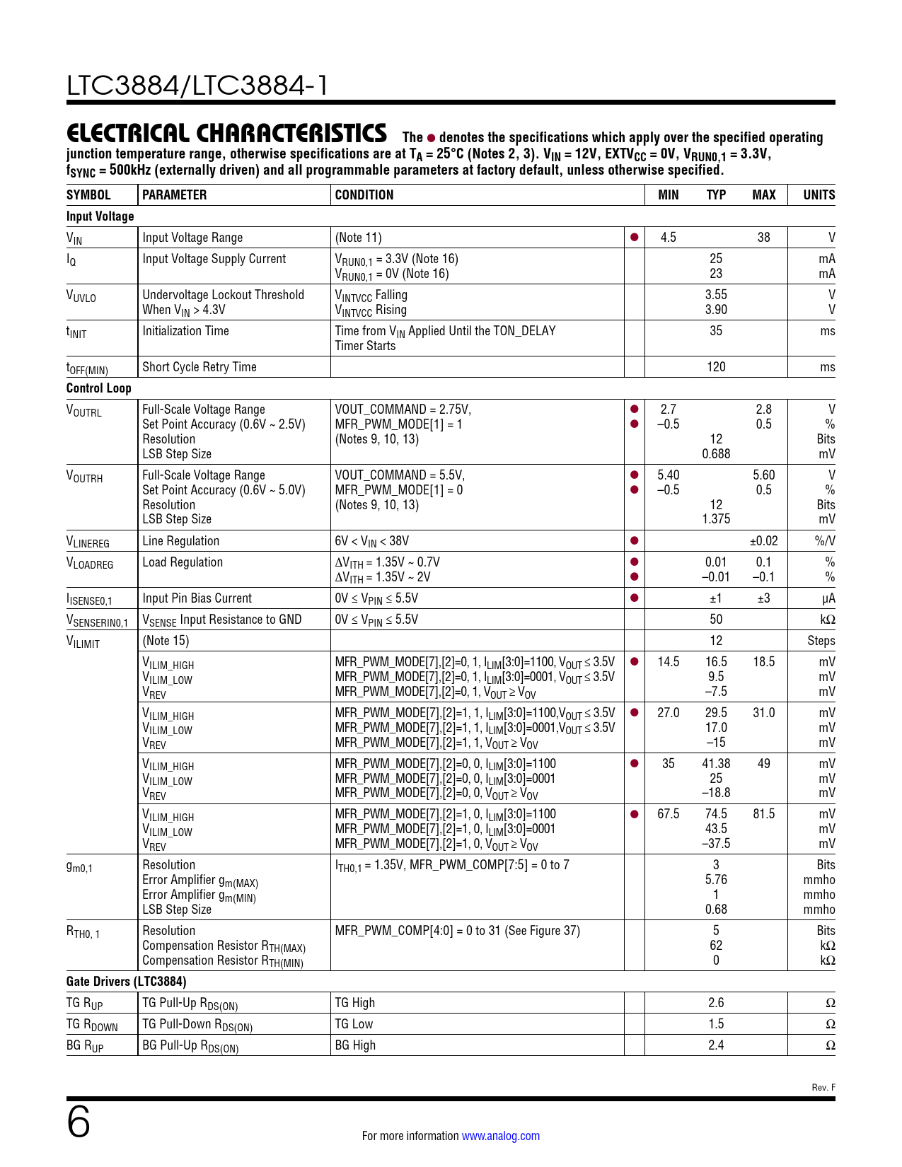 VOUTRL Full-Scale Voltage Range VOUT_COMMAND = 2.75V, l 2.7 2.8 V Set Point Accuracy (0.6V ~ 2.5V) MFR_PWM_MODE[1] = 1 l –0.5 0.5 % Resolution (Notes 9, 10, 13) 12 Bits LSB Step Size 0.688 mV VOUTRH Full-Scale Voltage Range VOUT_COMMAND = 5.5V, l 5.40 5.60 V Set Point Accuracy (0.6V ~ 5.0V) MFR_PWM_MODE[1] = 0 l –0.5 0.5 % Resolution (Notes 9, 10, 13) 12 Bits LSB Step Size 1.375 mV VLINEREG Line Regulation 6V < VIN < 38V l ±0.02 %/V VLOADREG Load Regulation ∆VITH = 1.35V ~ 0.7V l 0.01 0.1 % ∆VITH = 1.35V ~ 2V l –0.01 –0.1 % IISENSE0,1 Input Pin Bias Current 0V ≤ VPIN ≤ 5.5V l ±1 ±3 µA VSENSERIN0,1 VSENSE Input Resistance to GND 0V ≤ VPIN ≤ 5.5V 50 kΩ VILIMIT (Note 15) 12 Steps VILIM_HIGH MFR_PWM_MODE[7],[2]=0, 1, ILIM[3:0]=1100, VOUT ≤ 3.5V l 14.5 16.5 18.5 mV VILIM_LOW MFR_PWM_MODE[7],[2]=0, 1, ILIM[3:0]=0001, VOUT ≤ 3.5V 9.5 mV VREV MFR_PWM_MODE[7],[2]=0, 1, VOUT ≥ VOV –7.5 mV VILIM_HIGH MFR_PWM_MODE[7],[2]=1, 1, ILIM[3:0]=1100,VOUT ≤ 3.5V l 27.0 29.5 31.0 mV VILIM_LOW MFR_PWM_MODE[7],[2]=1, 1, ILIM[3:0]=0001,VOUT ≤ 3.5V 17.0 mV VREV MFR_PWM_MODE[7],[2]=1, 1, VOUT ≥ VOV –15 mV VILIM_HIGH MFR_PWM_MODE[7],[2]=0, 0, ILIM[3:0]=1100 l 35 41.38 49 mV VILIM_LOW MFR_PWM_MODE[7],[2]=0, 0, ILIM[3:0]=0001 25 mV VREV MFR_PWM_MODE[7],[2]=0, 0, VOUT ≥ VOV –18.8 mV VILIM_HIGH MFR_PWM_MODE[7],[2]=1, 0, ILIM[3:0]=1100 l 67.5 74.5 81.5 mV VILIM_LOW MFR_PWM_MODE[7],[2]=1, 0, ILIM[3:0]=0001 43.5 mV VREV MFR_PWM_MODE[7],[2]=1, 0, VOUT ≥ VOV –37.5 mV gm0,1 Resolution ITH0,1 = 1.35V, MFR_PWM_COMP[7:5] = 0 to 7 3 Bits Error Amplifier gm(MAX) 5.76 mmho Error Amplifier gm(MIN) 1 mmho LSB Step Size 0.68 mmho RTH0, 1 Resolution MFR_PWM_COMP[4:0] = 0 to 31 (See Figure 37) 5 Bits Compensation Resistor RTH(MAX) 62 kΩ Compensation Resistor RTH(MIN) 0 kΩ