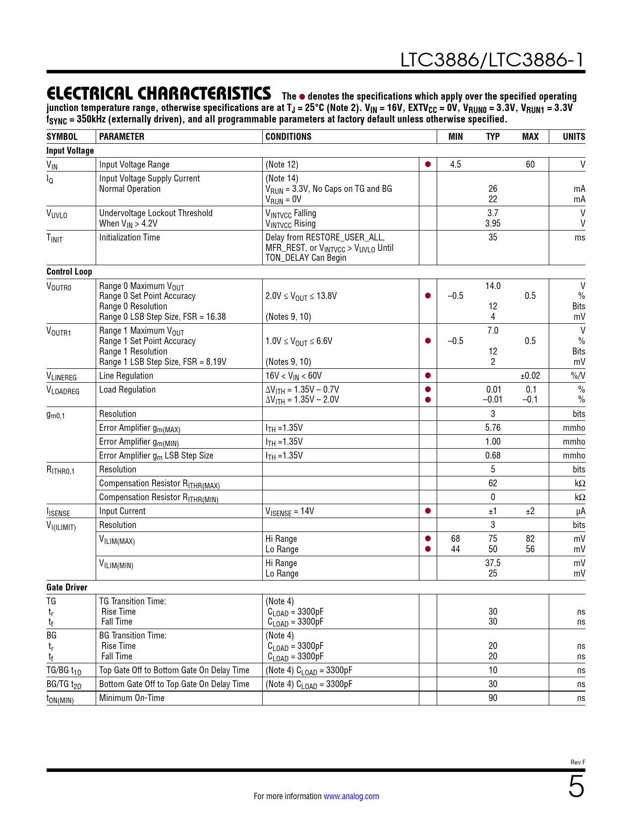 LTC3886/LTC3886-1 ELECTRICAL CHARACTERISTICSThe l denotes the specifications which apply over the specified operatingjunction temperature range, otherwise specifications are at TJ = 25°C (Note 2). VIN = 16V, EXTVCC = 0V, VRUN0 = 3.3V, VRUN1 = 3.3VfSYNC = 350kHz (externally driven), and all programmable parameters at factory default unless otherwise specified. SYMBOLPARAMETERCONDITIONSMINTYPMAXUNITSInput Voltage VIN Input Voltage Range (Note 12) l 4.5 60 V IQ Input Voltage Supply Current (Note 14) Normal Operation VRUN = 3.3V, No Caps on TG and BG 26 mA VRUN = 0V 22 mA VUVLO Undervoltage Lockout Threshold VINTVCC Falling 3.7 V When VIN > 4.2V VINTVCC Rising 3.95 V TINIT Initialization Time Delay from RESTORE_USER_ALL, 35 ms MFR_REST, or VINTVCC > VUVLO Until TON_DELAY Can Begin Control Loop VOUTR0 Range 0 Maximum VOUT 14.0 V Range 0 Set Point Accuracy 2.0V ≤ VOUT ≤ 13.8V l –0.5 0.5 % Range 0 Resolution 12 Bits Range 0 LSB Step Size, FSR = 16.38 (Notes 9, 10) 4 mV VOUTR1 Range 1 Maximum VOUT 7.0 V Range 1 Set Point Accuracy 1.0V ≤ VOUT ≤ 6.6V l –0.5 0.5 % Range 1 Resolution 12 Bits Range 1 LSB Step Size, FSR = 8.19V (Notes 9, 10) 2 mV VLINEREG Line Regulation 16V < VIN < 60V l ±0.02 %/V VLOADREG Load Regulation ∆VITH = 1.35V – 0.7V l 0.01 0.1 % ∆VITH = 1.35V – 2.0V l –0.01 –0.1 % gm0,1 Resolution 3 bits Error Amplifier gm(MAX) ITH =1.35V 5.76 mmho Error Amplifier gm(MIN) ITH =1.35V 1.00 mmho Error Amplifier gm LSB Step Size ITH =1.35V 0.68 mmho RITHR0,1 Resolution 5 bits Compensation Resistor RITHR(MAX) 62 kΩ Compensation Resistor RITHR(MIN) 0 kΩ IISENSE Input Current VISENSE = 14V l ±1 ±2 µA VI(lLIMIT) Resolution 3 bits VILIM(MAX) Hi Range l 68 75 82 mV Lo Range l 44 50 56 mV VILIM(MIN) Hi Range 37.5 mV Lo Range 25 mV Gate Driver TG TG Transition Time: (Note 4) tr Rise Time CLOAD = 3300pF 30 ns tf Fall Time CLOAD = 3300pF 30 ns BG BG Transition Time: (Note 4) tr Rise Time CLOAD = 3300pF 20 ns tf Fall Time CLOAD = 3300pF 20 ns TG/BG t1D Top Gate Off to Bottom Gate On Delay Time (Note 4) CLOAD = 3300pF 10 ns BG/TG t2D Bottom Gate Off to Top Gate On Delay Time (Note 4) CLOAD = 3300pF 30 ns tON(MIN) Minimum On-Time 90 ns Rev F For more information www.analog.com 5 Document Outline Table of Contents Features Power Conversion Applications Typical Application Description Table of Contents Absolute Maximum Ratings Order Information Pin Configuration Electrical Characteristics Typical Performance Characteristics Pin Functions Block Diagram Operation Overview Main Control Loop EEPROM Power-Up and Initialization Soft-Start Time-Based Sequencing Event-Based Sequencing Shutdown Light-Load Current Operation PWM Loop Compensation Switching Frequency and Phase Output Voltage Sensing Output Current Sensing Input Current Sensing PolyPhase Load Sharing External/Internal Temperature Sense RCONFIG (Resistor Configuration) Pins Fault Handling Status Registers and ALERT Masking Mapping Faults to FAULT Pins Power Good Pins CRC Protection Serial Interface Communication Protection Device Addressing Responses to VOUT and IOUT Faults Output Overvoltage Fault Response Output Undervoltage Response Peak Output Overcurrent Fault Response Responses to Timing Faults Responses to VIN OV Faults Responses to OT/UT Faults Internal Overtemperature Fault/Warn Response External Overtemperature and Undertemperature Fault Response Responses to External Faults Fault Logging Bus Timeout Protection Similarity Between PMBus, SMBus and I2C 2-Wire Interface PMBus Serial Digital Interface PMBus Command Summary PMBus Commands *Data Format Applications Information Current Limit Programming ISENSE+ and ISENSE– Pins Low Value Resistor Current Sensing Inductor DCR Current Sensing Slope Compensation and Inductor Peak Current Inductor Value Calculation Inductor Core Selection Power MOSFET and Optional Schottky Diode Selection CIN and COUT Selection Variable Delay Time, Soft-Start and Output Voltage Ramping Digital Servo Mode Soft Off (Sequenced Off) INTVCC Regulator Topside MOSFET Driver Supply (CB, DB) Undervoltage Lockout Fault Indications Open-Drain Pins Phase-Locked Loop and Frequency Synchronization Minimum On-Time Considerations External Temperature Sense Derating EEPROM Retention at Temperature Input Current Sense Amplifier External Resistor Configuration Pins (RCONFIG) Voltage Selection Frequency Selection Phase Selection Address Selection Using RCONFIG Efficiency Considerations Programmable Loop Compensation Checking Transient Response PolyPhase Configuration PC Board Layout Checklist PC Board Layout Debugging Design Example Additional Design Checks Connecting the USB to I2C/SMBus/PMBus Adapter to the LTC3886 In System LTpowerPlay: An Interactive GUI for Digital Power PMBus Communication and Command Processing PMBus Command Details Addressing and Write Protect General Configuration COMMANDS On/Off/Margin ON_OFF_CONFIG PWM Configuration Voltage Input Voltage and Limits Output Voltage and Limits For EnableMfrVoffThreshold = 0 For EnableMfrVoffThreshold = 1 Output Current and Limits Input Current and Limits Temperature External Temperature Calibration Timing Timing—On Sequence/Ramp Timing—Off Sequence/Ramp Precondition for Restart Fault Response Fault Responses All Faults Fault Responses Input Voltage Fault Responses Output Voltage Fault Responses Output Current Fault Responses IC Temperature Fault Responses External Temperature Fault Sharing Fault Sharing Propagation Fault Sharing Response Scratchpad Identification Fault Warning and Status Telemetry EEPROM Memory Commands Store/Restore Fault Logging Fault Log Operation Block Memory Write/Read Typical Applications Package Description Revision History Typical Application Related Parts