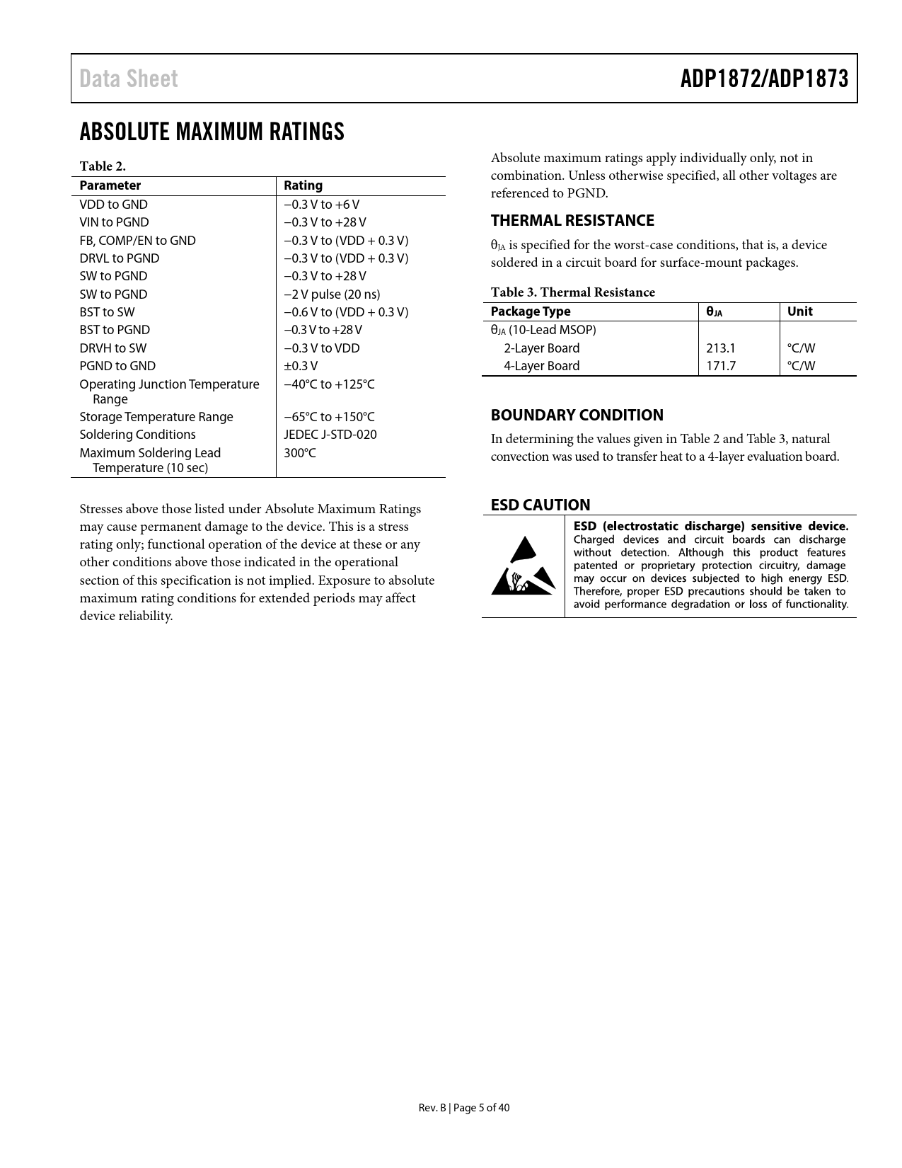 Data Sheet ADP1872/ADP1873 ABSOLUTE MAXIMUM RATINGS Table 2 Parameter Rating THERMAL RESISTANCE Table 3 Thermal Resistance