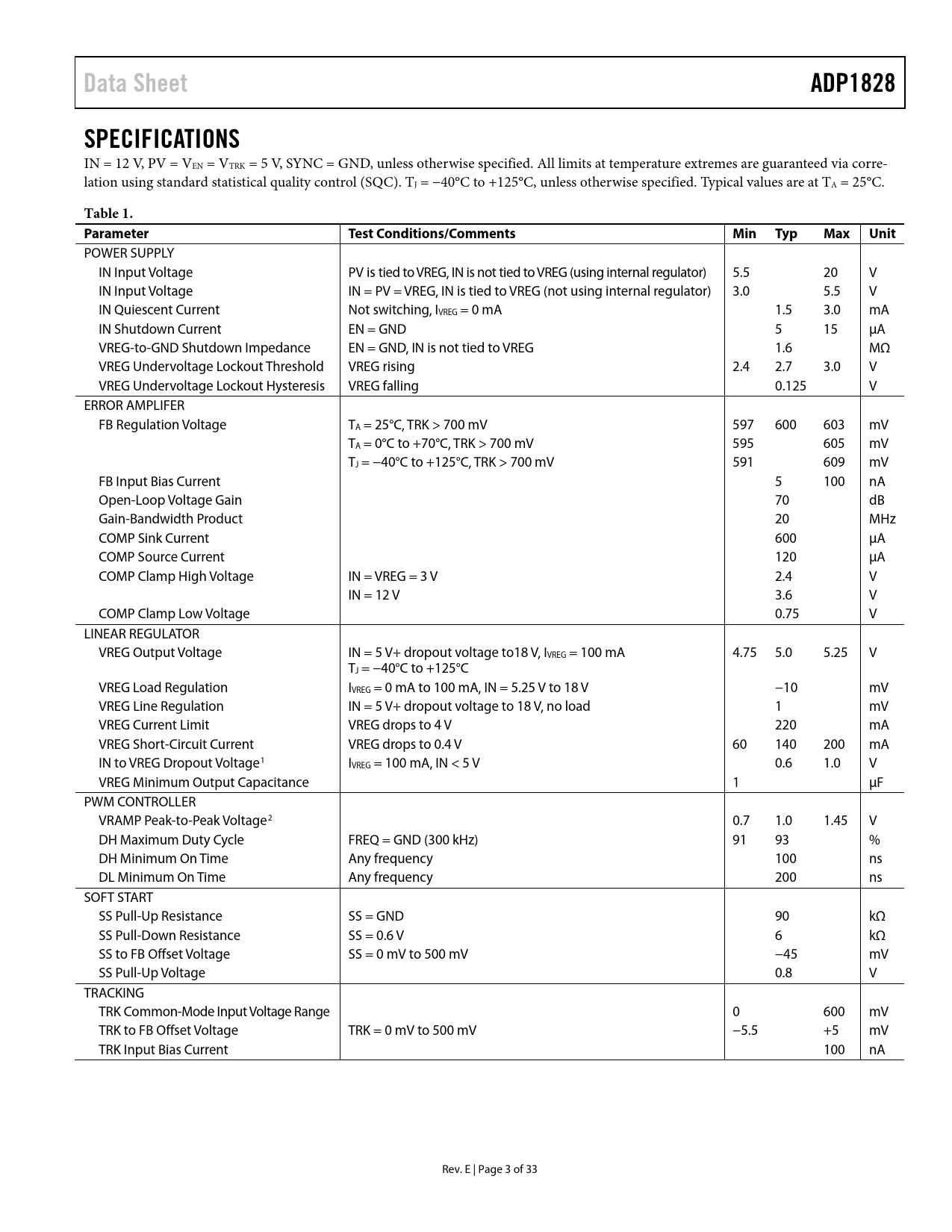 Data Sheet. ADP1828. SPECIFICATIONS. Table 1. Parameter. Test Conditions/Comments. Min Typ. Max. Unit