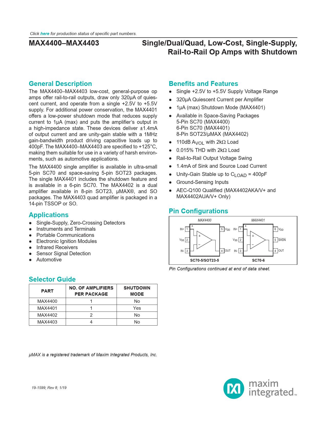 Click here for production status of specific part numbers. MAX4400–MAX4403Single/Dual/Quad, Low-Cost, Single-Supply,Rail-to-Rail Op Amps with ShutdownGeneral DescriptionBenefits and Features The MAX4400–MAX4403 low-cost, general-purpose op ● Single +2.5V to +5.5V Supply Voltage Range amps offer rail-to-rail outputs, draw only 320µA of quies- ● 320µA Quiescent Current per Amplifier cent current, and operate from a single +2.5V to +5.5V supply. For additional power conservation, the MAX4401 ● 1µA (max) Shutdown Mode (MAX4401) offers a low-power shutdown mode that reduces supply ● Available in Space-Saving Packages current to 1µA (max) and puts the amplifier’s output in 5-Pin SC70 (MAX4400) a high-impedance state. These devices deliver ±1.4mA 6-Pin SC70 (MAX4401) of output current and are unity-gain stable with a 1MHz 8-Pin SOT23/µMAX (MAX4402) gain-bandwidth product driving capacitive loads up to ● 110dB A 400pF. The MAX4400–MAX4403 are specified to +125°C, VOL with 2kΩ Load making them suitable for use in a variety of harsh environ- ● 0.015% THD with 2kΩ Load ments, such as automotive applications. ● Rail-to-Rail Output Voltage Swing The MAX4400 single amplifier is available in ultra-small ● 1.4mA of Sink and Source Load Current 5-pin SC70 and space-saving 5-pin SOT23 packages. ● Unity-Gain Stable up to CLOAD = 400pF The single MAX4401 includes the shutdown feature and is available in a 6-pin SC70. The MAX4402 is a dual ● Ground-Sensing Inputs amplifier available in 8-pin SOT23, µMAX®, and SO ● AEC-Q100 Qualified (MAX4402AKA/V+ and packages. The MAX4403 quad amplifier is packaged in a MAX4402AUA/V+ Only) 14-pin TSSOP or SO. ApplicationsPin Configurations ● Single-Supply, Zero-Crossing Detectors MAX4400 MAX4401 ● Instruments and Terminals ++ IN+ 1 5 VDD IN+ 1 6 VDD ● Portable Communications ● Electronic Ignition Modules VSS 2 VSS 2 5 SHDN ● Infrared Receivers ● Sensor Signal Detection IN- 3 4 OUT IN- 3 4 OUT ● Automotive SC70-5/SOT23-5SC70-6 Pin Configurations continued at end of data sheet. Selector GuidePARTNO. OF AMPLIFIERSSHUTDOWNPER PACKAGEMODE MAX4400 1 No MAX4401 1 Yes MAX4402 2 No MAX4403 4 No µMAX is a registered trademark of Maxim Integrated Products, Inc. 19-1599; Rev 8; 1/19