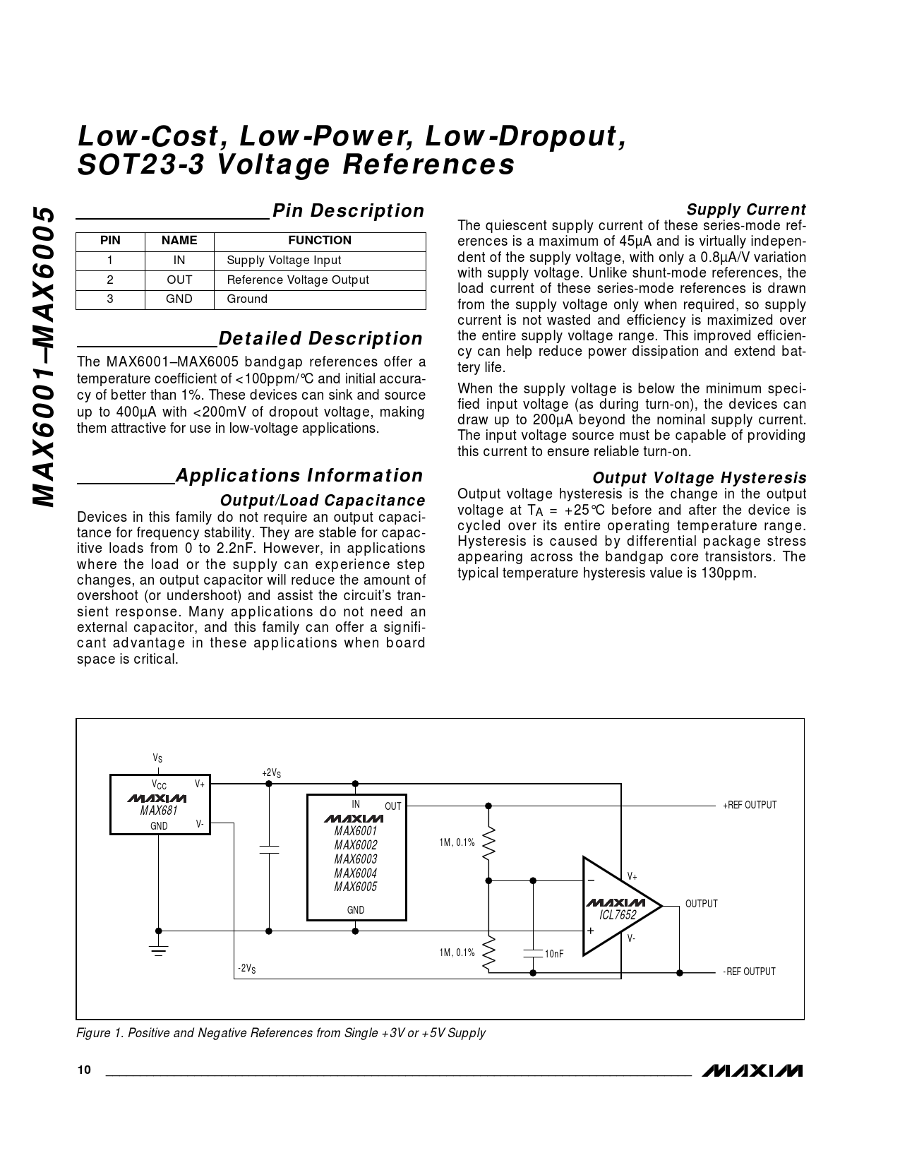 Low-Cost, Low-Power, Low-Dropout, SOT23-3 Voltage ReferencesPin DescriptionSupply Current The quiescent supply current of these series-mode ref- PINNAMEFUNCTION erences is a maximum of 45µA and is virtually indepen- 1 IN Supply Voltage Input dent of the supply voltage, with only a 0.8µA/V variation with supply voltage. Unlike shunt-mode references, the 2 OUT Reference Voltage Output load current of these series-mode references is drawn 3 GND Ground from the supply voltage only when required, so supply current is not wasted and efficiency is maximized over Detailed Description the entire supply voltage range. This improved efficien- cy can help reduce power dissipation and extend bat- The MAX6001–MAX6005 bandgap references offer a tery life. temperature coefficient of <100ppm/°C and initial accura- When the supply voltage is below the minimum speci- cy of better than 1%. These devices can sink and source fied input voltage (as during turn-on), the devices can up to 400µA with <200mV of dropout voltage, making draw up to 200µA beyond the nominal supply current. them attractive for use in low-voltage applications. The input voltage source must be capable of providing this current to ensure reliable turn-on. Applications InformationOutput Voltage HysteresisMAX6001–MAX6005Output/Load Capacitance Output voltage hysteresis is the change in the output voltage at T Devices in this family do not require an output capaci- A = +25°C before and after the device is cycled over its entire operating temperature range. tance for frequency stability. They are stable for capac- Hysteresis is caused by differential package stress itive loads from 0 to 2.2nF. However, in applications appearing across the bandgap core transistors. The where the load or the supply can experience step typical temperature hysteresis value is 130ppm. changes, an output capacitor will reduce the amount of overshoot (or undershoot) and assist the circuit’s tran- sient response. Many applications do not need an external capacitor, and this family can offer a signifi- cant advantage in these applications when board space is critical. VS +2VS VCC V+ IN OUT +REF OUTPUT MAX681 GND V- MAX6001 1M, 0.1% MAX6002 MAX6003 MAX6004 V+ MAX6005 OUTPUT GND ICL7652 V- 1M, 0.1% 10nF -2VS -REF OUTPUT Figure 1. Positive and Negative References from Single +3V or +5V Supply 10______________________________________________________________________________________