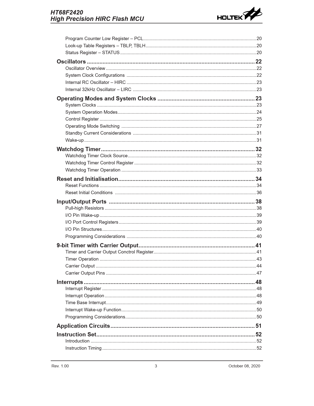 HT68F2420. High Precision HIRC Flash MCU. Oscillators ...22. Operating Modes and System Clocks ..23. Watchdog Timer ..32