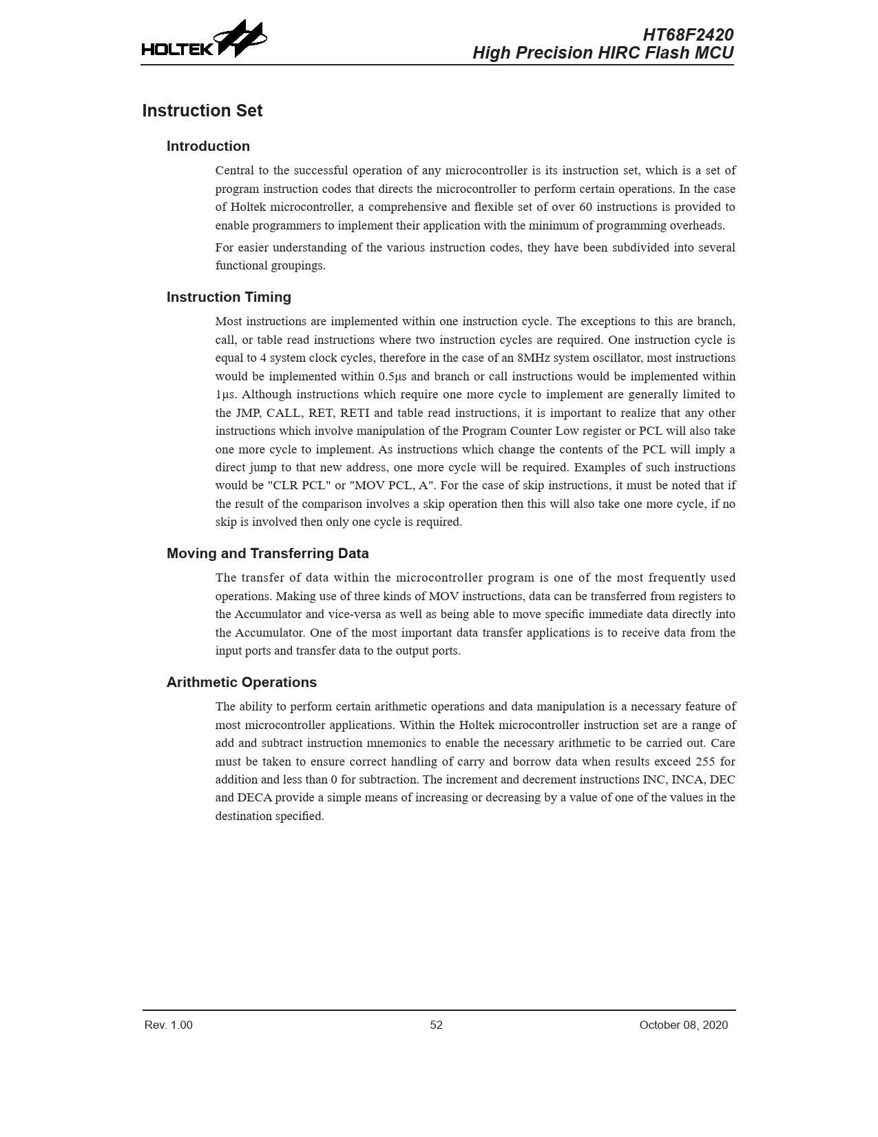HT68F2420HT68F2420High Precision HIRC Flash MCUHigh Precision HIRC Flash MCUInstruction SetIntroduction Central to the successful operation of any microcontroller is its instruction set, which is a set of program instruction codes that directs the microcontroller to perform certain operations. In the case of Holtek microcontroller, a comprehensive and flexible set of over 60 instructions is provided to enable programmers to implement their application with the minimum of programming overheads. For easier understanding of the various instruction codes, they have been subdivided into several functional groupings. Instruction Timing Most instructions are implemented within one instruction cycle. The exceptions to this are branch, call, or table read instructions where two instruction cycles are required. One instruction cycle is equal to 4 system clock cycles, therefore in the case of an 8MHz system oscillator, most instructions would be implemented within 0.5μs and branch or call instructions would be implemented within 1μs. Although instructions which require one more cycle to implement are generally limited to the JMP, CALL, RET, RETI and table read instructions, it is important to realize that any other instructions which involve manipulation of the Program Counter Low register or PCL will also take one more cycle to implement. As instructions which change the contents of the PCL will imply a direct jump to that new address, one more cycle will be required. Examples of such instructions would be "CLR PCL" or "MOV PCL, A". For the case of skip instructions, it must be noted that if the result of the comparison involves a skip operation then this will also take one more cycle, if no skip is involved then only one cycle is required. Moving and Transferring Data The transfer of data within the microcontroller program is one of the most frequently used operations. Making use of three kinds of MOV instructions, data can be transferred from registers to the Accumulator and vice-versa as well as being able to move specific immediate data directly into the Accumulator. One of the most important data transfer applications is to receive data from the input ports and transfer data to the output ports. Arithmetic Operations The ability to perform certain arithmetic operations and data manipulation is a necessary feature of most microcontroller applications. Within the Holtek microcontroller instruction set are a range of add and subtract instruction mnemonics to enable the necessary arithmetic to be carried out. Care must be taken to ensure correct handling of carry and borrow data when results exceed 255 for addition and less than 0 for subtraction. The increment and decrement instructions INC, INCA, DEC and DECA provide a simple means of increasing or decreasing by a value of one of the values in the destination specified. Rev. 1.00 52 October 08, 2020 Rev. 1.00 53 October 08, 2020 Document Outline Features CPU Features Peripheral Features General Description Block Diagram Pin Assignment Pin Description Absolute Maximum Ratings D.C. Characteristics Operating Voltage Characteristics Operating Current Characteristics Standby Current Characteristics A.C. Characteristics Internal Oscillator Characteristics System Start Up Time Characteristics Input/Output Characteristics REM/REMDRV Pin Characteristics LVR Electrical Characteristics Power on Reset Characteristics System Architecture Clocking and Pipelining Program Counter Stack Arithmetic and Logic Unit – ALU Flash Program Memory Structure Special Vectors Look-up Table Table Program Example In Circuit Programming – ICP On-Chip Debug Support – OCDS Data Memory Structure General Purpose Data Memory Special Purpose Data Memory Special Function Register Description Indirect Addressing Registers – IAR0 Memory Pointers – MP0 Accumulator – ACC Program Counter Low Register – PCL Look-up Table Registers – TBLP, TBLH Status Register – STATUS Oscillators Oscillator Overview System Clock Configurations Internal RC Oscillator – HIRC Internal 32kHz Oscillator – LIRC Operating Modes and System Clocks System Clocks System Operation Modes Control Register Operating Mode Switching Standby Current Considerations Wake-up Watchdog Timer Watchdog Timer Clock Source Watchdog Timer Control Register Watchdog Timer Operation Reset and Initialisation Reset Functions Reset Initial Conditions Input/Output Ports Pull-high Resistors I/O Pin Wake-up I/O Port Control Registers I/O Pin Structures Programming Considerations 9-bit Timer with Carrier Output Timer and Carrier Output Conctrol Register Timer Operation Carrier Output Carrier Output Pins Interrupts Interrupt Register Interrupt Operation Time Base Interrupt Interrupt Wake-up Function Programming Considerations Application Circuits Instruction Set Introduction Instruction Timing Moving and Transferring Data Arithmetic Operations Logical and Rotate Operation Branches and Control Transfer Bit Operations Table Read Operations Other Operations Instruction Set Summary Table Conventions Instruction Definition Package Information 8-pin SOP (150mil) Outline Dimensions 16-pin NSOP (150mil) Outline Dimensions 20-pin NSOP (150mil) Outline Dimensions 20-pin SSOP (150mil) Outline Dimensions