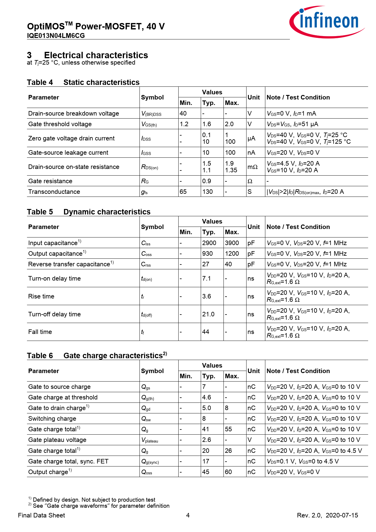 OptiMOSTMPower-MOSFET,40V IQE013N04LM6CG. 3Electricalcharacteristics. Table4Staticcharacteristics. Values. Parameter. Symbol