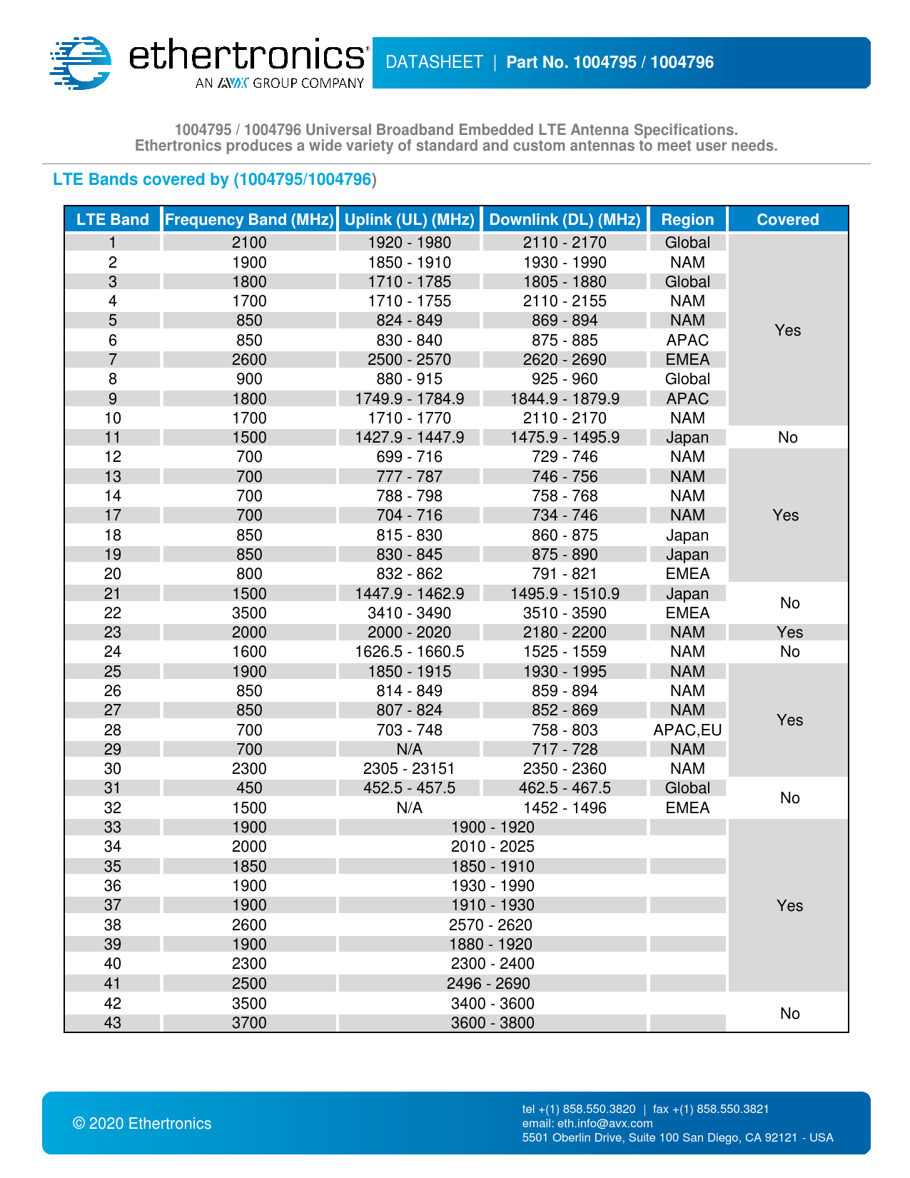 Part No. 1004795 / 1004796 1004795 / 1004796 Universal Broadband Embedded LTE Antenna Specifications. Ethertronics produces a wide variety of standard and custom antennas to meet user needs. LTE Bands covered by (1004795/1004796) LTE Band Frequency Band (MHz) Uplink (UL) (MHz) Downlink (DL) (MHz) Region Covered