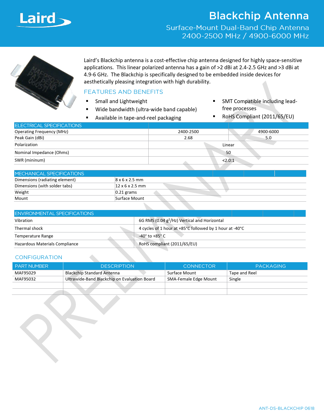 A Laird’s Blackchip antenna is a cost-effective chip antenna designed for highly space-sensitive applications. This linear polarized antenna has a gain of >2 dBi at 2.4-2.5 GHz and >3 dBi at 4.9-6 GHz. The Blackchip is specifically designed to be embedded inside devices for aesthetically pleasing integration with high durability. ▪ Small and Lightweight ▪ SMT Compatible including lead- ▪ Wide bandwidth (ultra-wide band capable) free processes ▪ Available in tape-and-reel packaging ▪ RoHS Compliant (2011/65/EU) Operating Frequency (MHz) 2400-2500 4900-6000 Peak Gain (dBi) 2.68 5.0 Polarization Linear Nominal Impedance (Ohms) 50 SWR (mininum) <2.0:1 Dimensions (radiating element) 8 x 6 x 2.5 mm Dimensions (with solder tabs) 12 x 6 x 2.5 mm Weight 0.21 grams Mount Surface Mount Vibration 6G RMS (0.04 g2/Hz) Vertical and Horizontal Thermal shock 4 cycles of 1 hour at +85°C followed by 1 hour at -40°C Temperature Range -40° to +85° C Hazardous Materials Compliance RoHS compliant (2011/65/EU) MAF95029 Blackchip Standard Antenna Surface Mount Tape and Reel MAF95032 Ultrawide-Band Blackchip on Evaluation Board SMA-Female Edge Mount Single