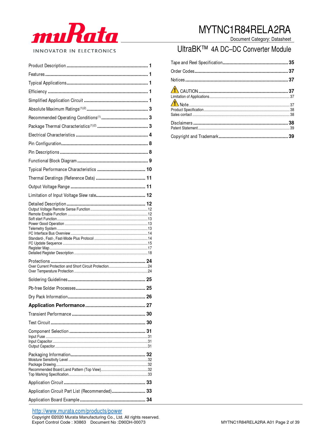 Copyright ©2020 Murata Manufacturing Co., Ltd. All rights reserved. Export Control Code : X0863 Document No :D90DH-00073 MYTNC1R84RELA2RA A01 Page 2 of 39 Document Outline Product Description Features Typical Applications Efficiency Simplified Application Circuit Absolute Maximum Ratings(1)(2) Recommended Operating Conditions(1) Package Thermal Characteristics(1)(2) Electrical Characteristics Pin Configuration Pin Descriptions Functional Block Diagram Typical Performance Characteristics Thermal Deratings (Reference Data) Output Voltage Range Limitation of Input Voltage Slew rate Detailed Description Output Voltage Remote Sense Function Remote Enable Function Soft start Function Power Good Operation Telemetry System I2C Interface Bus Overview Standard-, Fast-, Fast-Mode Plus Protocol I2C Update Sequence Register Map Detailed Register Description Protections Over Current Protection and Short Circuit Protection Over Temperature Protection Soldering Guidelines Pb-free Solder Processes Dry Pack Information Application Performance Transient Performance Test Circuit Component Selection Input Fuse Input Capacitor Output Capacitor Packaging Information Moisture Sensitivity Level Package Drawing Recommended Board Land Pattern (Top View) Top Marking Specification Application Circuit Application Circuit Part List (Recommended) Application Board Example Tape and Reel Specification Order Codes Notices CAUTION Limitation of Applications Note Product Specification Sales contact Disclaimers Patent Statement Copyright and Trademark