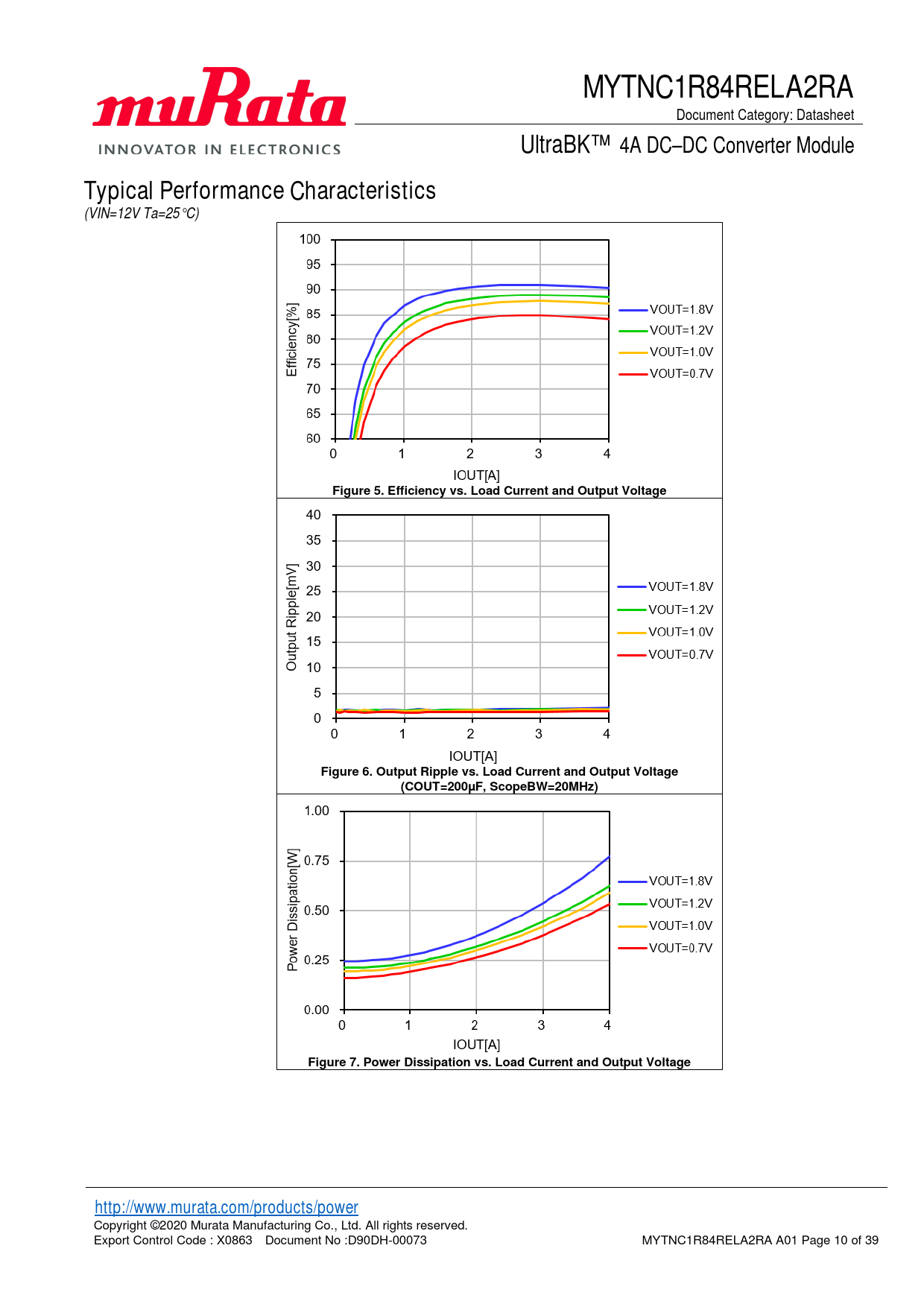 Figure 5. Efficiency vs. Load Current and Output Voltage Figure 6. Output Ripple vs. Load Current and Output Voltage (COUT=200µF, ScopeBW=20MHz) Figure 7. Power Dissipation vs. Load Current and Output Voltage http://www.murata.com/products/power