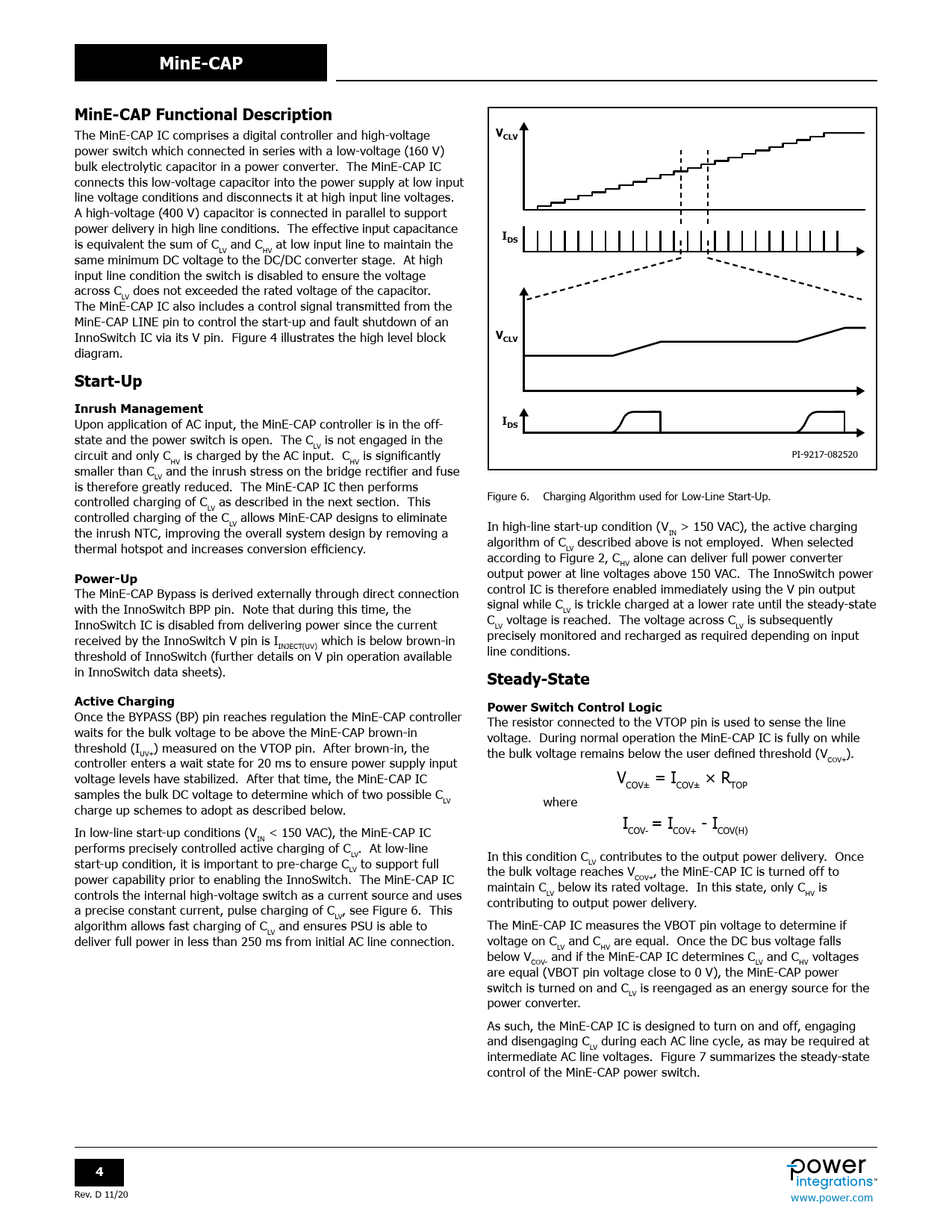MinE-CAPMinE-CAP Functional Description The MinE-CAP IC comprises a digital control er and high-voltage VCLV power switch which connected in series with a low-voltage (160 V) bulk electrolytic capacitor in a power converter. The MinE-CAP IC connects this low-voltage capacitor into the power supply at low input line voltage conditions and disconnects it at high input line voltages. A high-voltage (400 V) capacitor is connected in paral el to support power delivery in high line conditions. The effective input capacitance is equivalent the sum of C and C at low input line to maintain the IDS LV HV same minimum DC voltage to the DC/DC converter stage. At high input line condition the switch is disabled to ensure the voltage across C does not exceeded the rated voltage of the capacitor. LV The MinE-CAP IC also includes a control signal transmitted from the MinE-CAP LINE pin to control the start-up and fault shutdown of an InnoSwitch IC via its V pin. Figure 4 il ustrates the high level block VCLV diagram. Start-Up Inrush Management Upon application of AC input, the MinE-CAP control er is in the off- IDS state and the power switch is open. The C is not engaged in the LV circuit and only C is charged by the AC input. C is significantly PI-9217-082520 HV HV smal er than C and the inrush stress on the bridge rectifier and fuse LV is therefore greatly reduced. The MinE-CAP IC then performs control ed charging of C as described in the next section. This Figure 6. Charging Algorithm used for Low-Line Start-Up. LV control ed charging of the C al ows MinE-CAP designs to eliminate LV the inrush NTC, improving the overall system design by removing a In high-line start-up condition (V > 150 VAC), the active charging IN thermal hotspot and increases conversion efficiency. algorithm of C described above is not employed. When selected LV according to Figure 2, C alone can deliver full power converter HV Power-Up output power at line voltages above 150 VAC. The InnoSwitch power The MinE-CAP Bypass is derived external y through direct connection control IC is therefore enabled immediately using the V pin output with the InnoSwitch BPP pin. Note that during this time, the signal while C is trickle charged at a lower rate until the steady-state LV InnoSwitch IC is disabled from delivering power since the current C voltage is reached. The voltage across C is subsequently LV LV received by the InnoSwitch V pin is I which is below brown-in precisely monitored and recharged as required depending on input INJECT(UV) threshold of InnoSwitch (further details on V pin operation available line conditions. in InnoSwitch data sheets). Steady-StateActive ChargingPower Switch Control Logic Once the BYPASS (BP) pin reaches regulation the MinE-CAP control er The resistor connected to the VTOP pin is used to sense the line waits for the bulk voltage to be above the MinE-CAP brown-in voltage. During normal operation the MinE-CAP IC is fully on while threshold (I ) measured on the VTOP pin. After brown-in, the UV+ the bulk voltage remains below the user defined threshold (V ). control er enters a wait state for 20 ms to ensure power supply input COV+ voltage levels have stabilized. After that time, the MinE-CAP IC V = I × R COV± COV± TOP samples the bulk DC voltage to determine which of two possible C LV where charge up schemes to adopt as described below. I = I - I In low-line start-up conditions (V < 150 VAC), the MinE-CAP IC COV- COV+ COV(H) IN performs precisely control ed active charging of C . At low-line LV start-up condition, it is important to pre-charge C to support full In this condition C contributes to the output power delivery. Once LV LV power capability prior to enabling the InnoSwitch. The MinE-CAP IC the bulk voltage reaches V , the MinE-CAP IC is turned off to COV+ controls the internal high-voltage switch as a current source and uses maintain C below its rated voltage. In this state, only C is LV HV a precise constant current, pulse charging of C , see Figure 6. This contributing to output power delivery. LV algorithm al ows fast charging of C and ensures PSU is able to The MinE-CAP IC measures the VBOT pin voltage to determine if LV deliver full power in less than 250 ms from initial AC line connection. voltage on C and C are equal. Once the DC bus voltage fal s LV HV below V and if the MinE-CAP IC determines C and C voltages COV- LV HV are equal (VBOT pin voltage close to 0 V), the MinE-CAP power switch is turned on and C is reengaged as an energy source for the LV power converter. As such, the MinE-CAP IC is designed to turn on and off, engaging and disengaging C during each AC line cycle, as may be required at LV intermediate AC line voltages. Figure 7 summarizes the steady-state control of the MinE-CAP power switch. 4 Rev. D 11/20 www.power.com