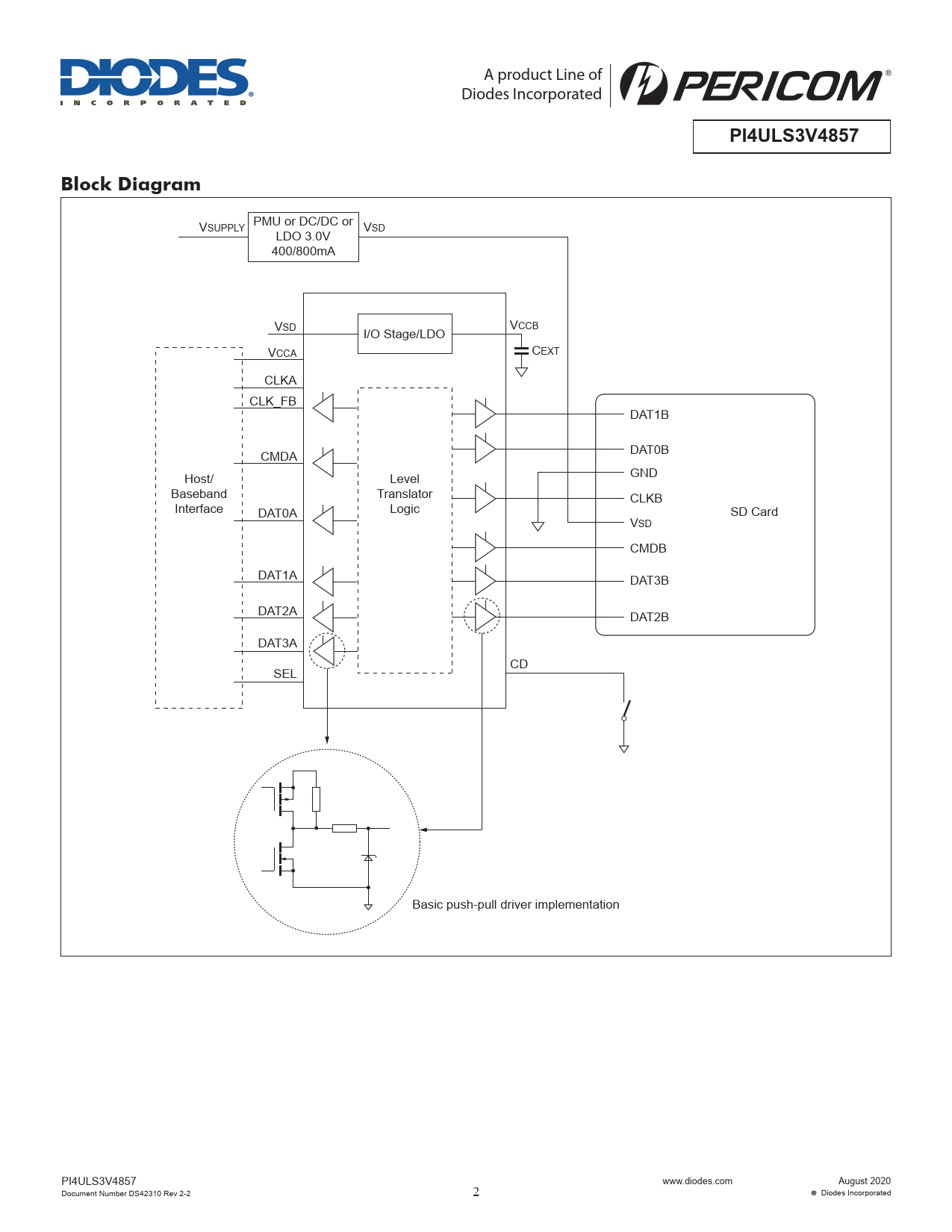 V PMU or DC/DC or SUPPLY VSD LDO 3.0V 400/800mA VSD V I/O Stage/LDO CCB VCCA CEXT CLKA CLK_FB DAT1B CMDA DAT0B Host/ Level GND Baseband Translator CLKB Interface Logic DAT0A SD Card VSD CMDB DAT1A DAT3B DAT2A DAT2B DAT3A CD SEL Basic push-pull driver implementation PI4ULS3V4857 www.diodes.com August 2020 Document Number DS42310 Rev 2-2 2 Diodes Incorporated