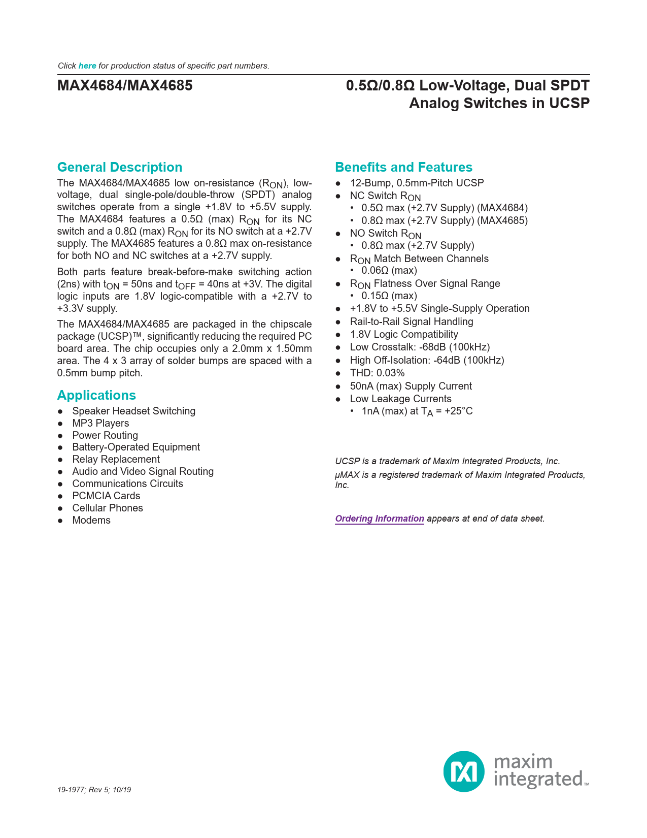 here. MAX4684/MAX4685. 0.5Ω/0.8Ω Low-Voltage, Dual SPDT. Analog Switches in UCSP. General Description. Benefits and Features