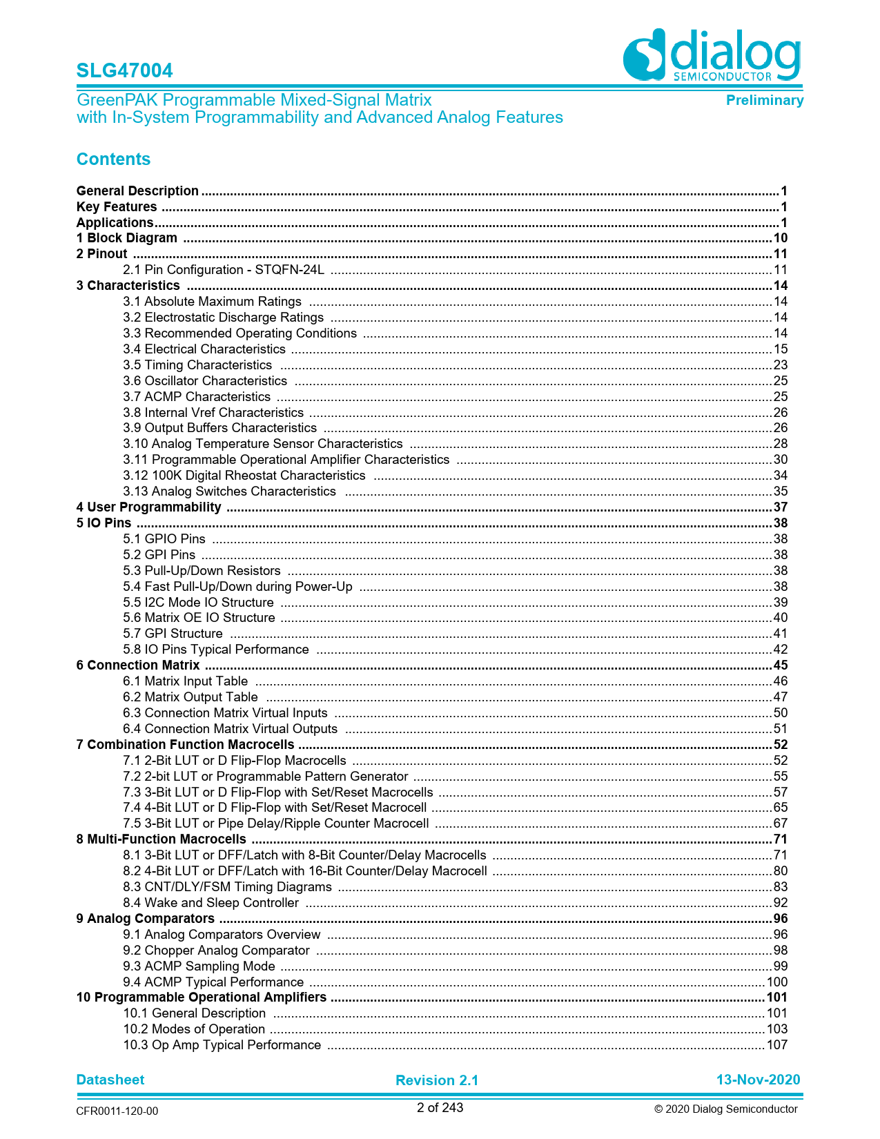 | Seiten / Seite | 243 / 2 — SLG47004. Preliminary. Contents. General Description ... 1 Key Features … |