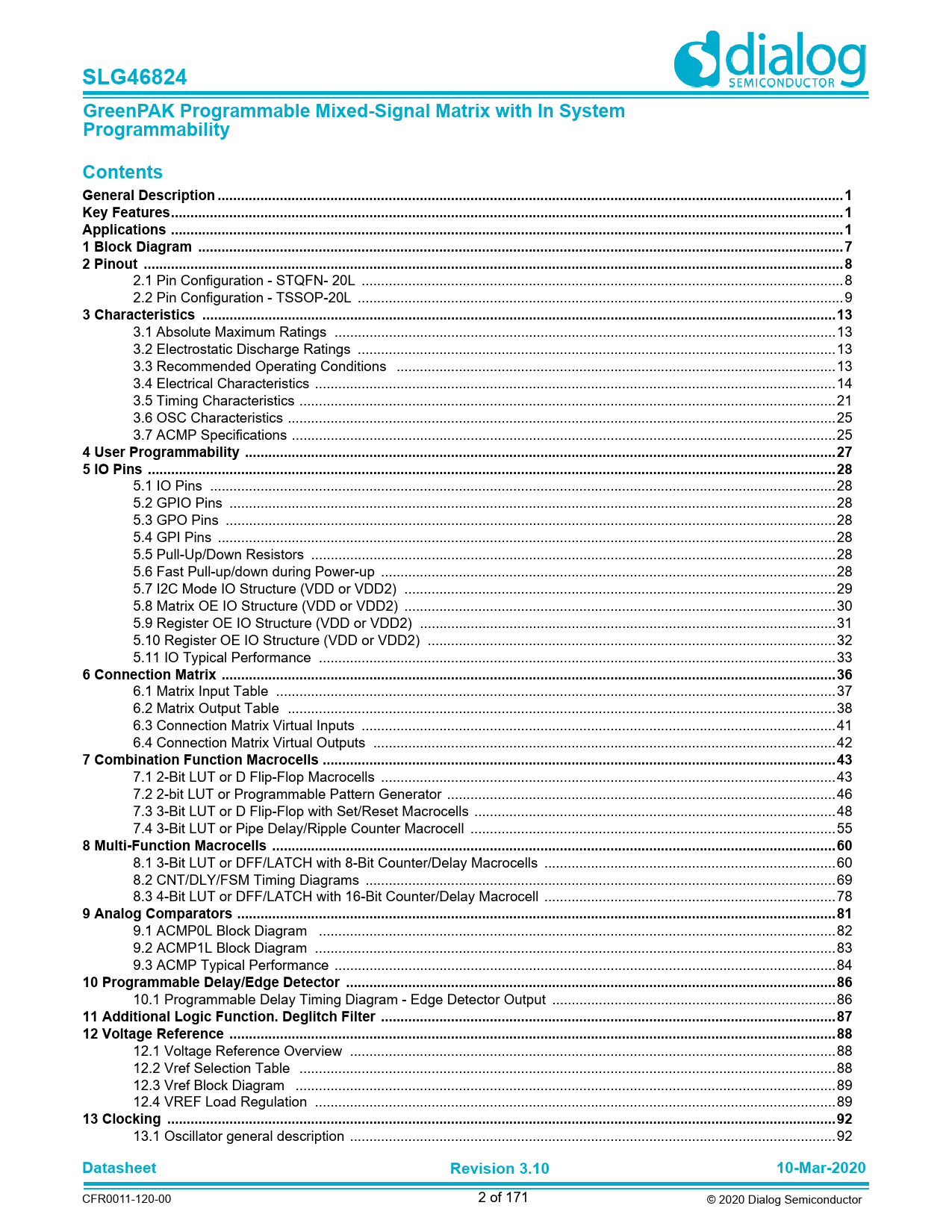 CFR0011-120-00 2 of 171 © 2020 Dialog Semiconductor Document Outline General Description Key Features Applications 1 Block Diagram 2 Pinout 2.1 Pin Configuration - STQFN- 20L 2.2 Pin Configuration - TSSOP-20L 3 Characteristics 3.1 Absolute Maximum Ratings 3.2 Electrostatic Discharge Ratings 3.3 Recommended Operating Conditions 3.4 Electrical Characteristics 3.5 Timing Characteristics 3.6 OSC Characteristics 3.6.1 OSC Specifications 3.6.2 OSC Power-On Delay 3.7 ACMP Specifications 4 User Programmability 5 IO Pins 5.1 IO Pins 5.2 GPIO Pins 5.3 GPO Pins 5.4 GPI Pins 5.5 Pull-Up/Down Resistors 5.6 Fast Pull-up/down during Power-up 5.7 I2C Mode IO Structure (VDD or VDD2) 5.7.1 I2C Mode Structure (for SCL and SDA) 5.8 Matrix OE IO Structure (VDD or VDD2) 5.8.1 Matrix OE IO Structure (for IOs 1, 4, 5 with VDD, and IOs 8, 9, 10, 11, 12, 13, 14 with VDD2) 5.9 Register OE IO Structure (VDD or VDD2) 5.9.1 Register OE IO Structure (for IOs 0, 2, 3 with VDD) 5.10 Register OE IO Structure (VDD or VDD2) 5.10.1 Register OE IO Structure (for IO 6 with VDD, and IO 7 with VDD2) 5.11 IO Typical Performance 6 Connection Matrix 6.1 Matrix Input Table 6.2 Matrix Output Table 6.3 Connection Matrix Virtual Inputs 6.4 Connection Matrix Virtual Outputs 7 Combination Function Macrocells 7.1 2-Bit LUT or D Flip-Flop Macrocells 7.1.1 2-Bit LUT or D Flip-Flop Macrocell Used as 2-Bit LUTT 7.1.2 Initial Polarity Operations 7.2 2-bit LUT or Programmable Pattern Generator 7.2.1 2-Bit LUT or PGen Macrocell Used as 2-Bit LUT 7.3 3-Bit LUT or D Flip-Flop with Set/Reset Macrocells 7.3.1 3-Bit LUT or D Flip-Flop Macrocells Used as 3-Bit LUTs 7.3.2 Initial Polarity Operations 7.4 3-Bit LUT or Pipe Delay/Ripple Counter Macrocell 7.4.1 3-Bit LUT or Pipe Delay Macrocells Used as 3-Bit LUT 8 Multi-Function Macrocells 8.1 3-Bit LUT or DFF/LATCH with 8-Bit Counter/Delay Macrocells 8.1.1 3-Bit LUT or 8-Bit CNT/DLY Block Diagrams 8.1.2 3-Bit LUT or CNT/DLYs Used as 3-Bit LUTs 8.2 CNT/DLY/FSM Timing Diagrams 8.2.1 Delay Mode CNT/DLY0 to CNT/DLY7 8.2.2 Count Mode (Count Data: 3), Counter Reset (Rising Edge Detect) CNT/DLY0 to CNT/DLY7 8.2.3 One-Shot Mode CNT/DLY0 to CNT/DLY7 8.2.4 Frequency Detection Mode CNT/DLY0 to CNT/DLY7 8.2.5 Edge Detection Mode CNT/DLY1 to CNT/DLY7 8.2.6 Delayed Edge Detection Mode CNT/DLY0 to CNT/DLY7 8.2.7 CNT/FSM Mode CNT/DLY0 8.2.8 Difference in Counter Value for Counter, Delay, One-Shot, and Frequency Detect Modes 8.3 4-Bit LUT or DFF/LATCH with 16-Bit Counter/Delay Macrocell 8.3.1 4-Bit LUT or 16-Bit CNT/DLY Block Diagram 8.3.2 4-Bit LUT or 16-Bit Counter/Delay Macrocells Used as 4-Bit LUTs 9 Analog Comparators 9.1 ACMP0L Block Diagram 9.2 ACMP1L Block Diagram 9.3 ACMP Typical Performance 10 Programmable Delay/Edge Detector 10.1 Programmable Delay Timing Diagram - Edge Detector Output 11 Additional Logic Function. Deglitch Filter 12 Voltage Reference 12.1 Voltage Reference Overview 12.2 Vref Selection Table 12.3 Vref Block Diagram 12.4 VREF Load Regulation 13 Clocking 13.1 Oscillator general description 13.2 Oscillator0 (2.048 kHz) 13.3 Oscillator1 (2.048 MHz) 13.4 Oscillator2 (25 MHz) 13.5 CNT/DLY Clock Scheme 13.6 External Clocking 13.6.1 IO0 Source for Oscillator0 (2.048 kHz) 13.6.2 IO10 Source for Oscillator1 (2.048 MHz) 13.6.3 IO8 Source for Oscillator2 (25 MHz) 13.7 Oscillators Power-On Delay 13.8 Oscillators Accuracy 14 Power-On Reset 14.1 General Operation 14.2 POR Sequence 14.3 Macrocells Output States During POR Sequence 14.3.1 Initialization 14.3.2 Power-Down 15 I2C Serial Communications Macrocell 15.1 I2C Serial Communications Macrocell Overview 15.2 I2C Serial Communications Device Addressing 15.3 I2C Serial General Timing 15.4 I2C Serial Communications Commands 15.4.1 Byte Write Command 15.4.2 Sequential Write Command 15.4.3 Current Address Read Command 15.4.4 Random Read Command 15.4.5 Sequential Read Command 15.4.6 I2C Serial Reset Command 15.5 Chip Configuration Data Protection 15.6 I2C Serial Command Register Map 15.7 I2C Additional Options 15.7.1 Reading Counter Data via I2C 15.7.2 I2C Expander 15.7.3 I2C Byte Write Bit Masking 16 Non-Volatile Memory 16.1 Serial NVM Write Operations 16.2 Serial NVM Read Operations 16.3 Serial NVM Erase Operations 17 Register Definitions 17.1 Register Map 18 Package Top Marking System Definition 18.1 STQFN 20L 2 mm x 3 mm 0.4P FCD Package 18.2 TSSOP-20 19 Package Information 19.1 Package outlines for STQFN 20L 2 mm x 3 mm 0.4P FCD 19.2 Package outlines for TSSOP 20L 173 MIL Green 19.3 STQFN and TSSOP Handling 19.4 Soldering Information 20 Ordering Information 20.1 Tape and Reel Specifications 20.2 Carrier Tape Drawing and Dimensions 20.3 STQFN-20L 20.4 TSSOP-20L 21 Layout Guidelines 21.1 STQFN 20L 2 mm x 3 mm 0.4P FCD Package 21.2 TSSOP-20 Glossary Revision History