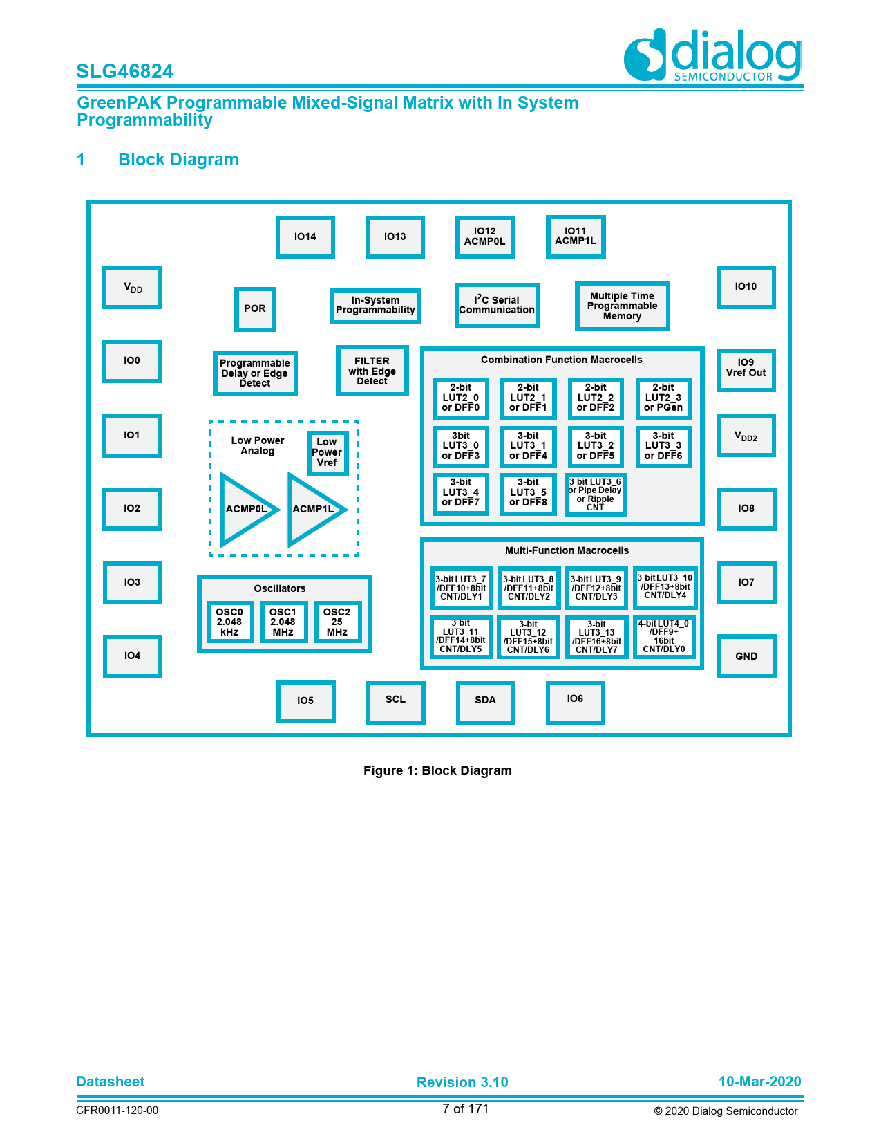 CFR0011-120-00 7 of 171 © 2020 Dialog Semiconductor Document Outline General Description Key Features Applications 1 Block Diagram 2 Pinout 2.1 Pin Configuration - STQFN- 20L 2.2 Pin Configuration - TSSOP-20L 3 Characteristics 3.1 Absolute Maximum Ratings 3.2 Electrostatic Discharge Ratings 3.3 Recommended Operating Conditions 3.4 Electrical Characteristics 3.5 Timing Characteristics 3.6 OSC Characteristics 3.6.1 OSC Specifications 3.6.2 OSC Power-On Delay 3.7 ACMP Specifications 4 User Programmability 5 IO Pins 5.1 IO Pins 5.2 GPIO Pins 5.3 GPO Pins 5.4 GPI Pins 5.5 Pull-Up/Down Resistors 5.6 Fast Pull-up/down during Power-up 5.7 I2C Mode IO Structure (VDD or VDD2) 5.7.1 I2C Mode Structure (for SCL and SDA) 5.8 Matrix OE IO Structure (VDD or VDD2) 5.8.1 Matrix OE IO Structure (for IOs 1, 4, 5 with VDD, and IOs 8, 9, 10, 11, 12, 13, 14 with VDD2) 5.9 Register OE IO Structure (VDD or VDD2) 5.9.1 Register OE IO Structure (for IOs 0, 2, 3 with VDD) 5.10 Register OE IO Structure (VDD or VDD2) 5.10.1 Register OE IO Structure (for IO 6 with VDD, and IO 7 with VDD2) 5.11 IO Typical Performance 6 Connection Matrix 6.1 Matrix Input Table 6.2 Matrix Output Table 6.3 Connection Matrix Virtual Inputs 6.4 Connection Matrix Virtual Outputs 7 Combination Function Macrocells 7.1 2-Bit LUT or D Flip-Flop Macrocells 7.1.1 2-Bit LUT or D Flip-Flop Macrocell Used as 2-Bit LUTT 7.1.2 Initial Polarity Operations 7.2 2-bit LUT or Programmable Pattern Generator 7.2.1 2-Bit LUT or PGen Macrocell Used as 2-Bit LUT 7.3 3-Bit LUT or D Flip-Flop with Set/Reset Macrocells 7.3.1 3-Bit LUT or D Flip-Flop Macrocells Used as 3-Bit LUTs 7.3.2 Initial Polarity Operations 7.4 3-Bit LUT or Pipe Delay/Ripple Counter Macrocell 7.4.1 3-Bit LUT or Pipe Delay Macrocells Used as 3-Bit LUT 8 Multi-Function Macrocells 8.1 3-Bit LUT or DFF/LATCH with 8-Bit Counter/Delay Macrocells 8.1.1 3-Bit LUT or 8-Bit CNT/DLY Block Diagrams 8.1.2 3-Bit LUT or CNT/DLYs Used as 3-Bit LUTs 8.2 CNT/DLY/FSM Timing Diagrams 8.2.1 Delay Mode CNT/DLY0 to CNT/DLY7 8.2.2 Count Mode (Count Data: 3), Counter Reset (Rising Edge Detect) CNT/DLY0 to CNT/DLY7 8.2.3 One-Shot Mode CNT/DLY0 to CNT/DLY7 8.2.4 Frequency Detection Mode CNT/DLY0 to CNT/DLY7 8.2.5 Edge Detection Mode CNT/DLY1 to CNT/DLY7 8.2.6 Delayed Edge Detection Mode CNT/DLY0 to CNT/DLY7 8.2.7 CNT/FSM Mode CNT/DLY0 8.2.8 Difference in Counter Value for Counter, Delay, One-Shot, and Frequency Detect Modes 8.3 4-Bit LUT or DFF/LATCH with 16-Bit Counter/Delay Macrocell 8.3.1 4-Bit LUT or 16-Bit CNT/DLY Block Diagram 8.3.2 4-Bit LUT or 16-Bit Counter/Delay Macrocells Used as 4-Bit LUTs 9 Analog Comparators 9.1 ACMP0L Block Diagram 9.2 ACMP1L Block Diagram 9.3 ACMP Typical Performance 10 Programmable Delay/Edge Detector 10.1 Programmable Delay Timing Diagram - Edge Detector Output 11 Additional Logic Function. Deglitch Filter 12 Voltage Reference 12.1 Voltage Reference Overview 12.2 Vref Selection Table 12.3 Vref Block Diagram 12.4 VREF Load Regulation 13 Clocking 13.1 Oscillator general description 13.2 Oscillator0 (2.048 kHz) 13.3 Oscillator1 (2.048 MHz) 13.4 Oscillator2 (25 MHz) 13.5 CNT/DLY Clock Scheme 13.6 External Clocking 13.6.1 IO0 Source for Oscillator0 (2.048 kHz) 13.6.2 IO10 Source for Oscillator1 (2.048 MHz) 13.6.3 IO8 Source for Oscillator2 (25 MHz) 13.7 Oscillators Power-On Delay 13.8 Oscillators Accuracy 14 Power-On Reset 14.1 General Operation 14.2 POR Sequence 14.3 Macrocells Output States During POR Sequence 14.3.1 Initialization 14.3.2 Power-Down 15 I2C Serial Communications Macrocell 15.1 I2C Serial Communications Macrocell Overview 15.2 I2C Serial Communications Device Addressing 15.3 I2C Serial General Timing 15.4 I2C Serial Communications Commands 15.4.1 Byte Write Command 15.4.2 Sequential Write Command 15.4.3 Current Address Read Command 15.4.4 Random Read Command 15.4.5 Sequential Read Command 15.4.6 I2C Serial Reset Command 15.5 Chip Configuration Data Protection 15.6 I2C Serial Command Register Map 15.7 I2C Additional Options 15.7.1 Reading Counter Data via I2C 15.7.2 I2C Expander 15.7.3 I2C Byte Write Bit Masking 16 Non-Volatile Memory 16.1 Serial NVM Write Operations 16.2 Serial NVM Read Operations 16.3 Serial NVM Erase Operations 17 Register Definitions 17.1 Register Map 18 Package Top Marking System Definition 18.1 STQFN 20L 2 mm x 3 mm 0.4P FCD Package 18.2 TSSOP-20 19 Package Information 19.1 Package outlines for STQFN 20L 2 mm x 3 mm 0.4P FCD 19.2 Package outlines for TSSOP 20L 173 MIL Green 19.3 STQFN and TSSOP Handling 19.4 Soldering Information 20 Ordering Information 20.1 Tape and Reel Specifications 20.2 Carrier Tape Drawing and Dimensions 20.3 STQFN-20L 20.4 TSSOP-20L 21 Layout Guidelines 21.1 STQFN 20L 2 mm x 3 mm 0.4P FCD Package 21.2 TSSOP-20 Glossary Revision History