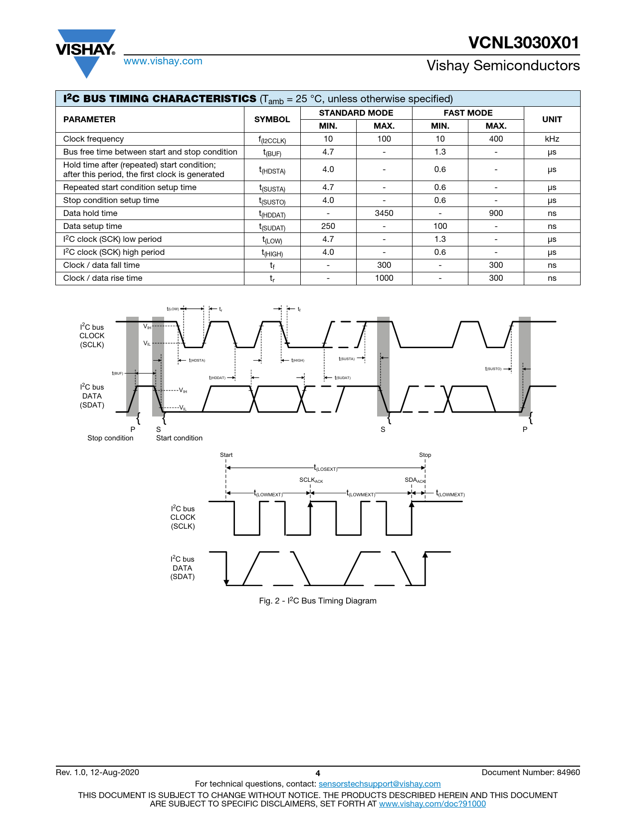 VCNL3030X01 www.vishay.com Vishay Semiconductors I2C BUS TIMING CHARACTERISTICS (Tamb = 25 °C, unless otherwise specified) STANDARD MODEFAST MODEPARAMETERSYMBOLUNITMIN.MAX.MIN.MAX. Clock frequency f(I2CCLK) 10 100 10 400 kHz Bus free time between start and stop condition t(BUF) 4.7 - 1.3 - μs Hold time after (repeated) start condition; t after this period, the first clock is generated (HDSTA) 4.0 - 0.6 - μs Repeated start condition setup time t(SUSTA) 4.7 - 0.6 - μs Stop condition setup time t(SUSTO) 4.0 - 0.6 - μs Data hold time t(HDDAT) - 3450 - 900 ns Data setup time t(SUDAT) 250 - 100 - ns I2C clock (SCK) low period t(LOW) 4.7 - 1.3 - μs I2C clock (SCK) high period t(HIGH) 4.0 - 0.6 - μs Clock / data fall time tf - 300 - 300 ns Clock / data rise time tr - 1000 - 300 ns t(LOW) tr tf VIH I2C bus CLOCK VIL (SCLK) t(HDSTA) t(HIGH) t(SUSTA) t(SUSTO) t(BUF) t(HDDAT) t(SUDAT) I2C bus VIH DATA (SDAT) VIL { { { { P S S P Stop condition Start condition Start Stop t(LOSEXT) SCLKACK SDAACK t(LOWMEXT) t(LOWMEXT) t(LOWMEXT) I2C bus CLOCK (SCLK) I2C bus DATA (SDAT) Fig. 2 - I2C Bus Timing Diagram Rev. 1.0, 12-Aug-2020 4 Document Number: 84960 For technical questions, contact: sensorstechsupport@vishay.com THIS DOCUMENT IS SUBJECT TO CHANGE WITHOUT NOTICE. THE PRODUCTS DESCRIBED HEREIN AND THIS DOCUMENT ARE SUBJECT TO SPECIFIC DISCLAIMERS, SET FORTH AT www.vishay.com/doc?91000