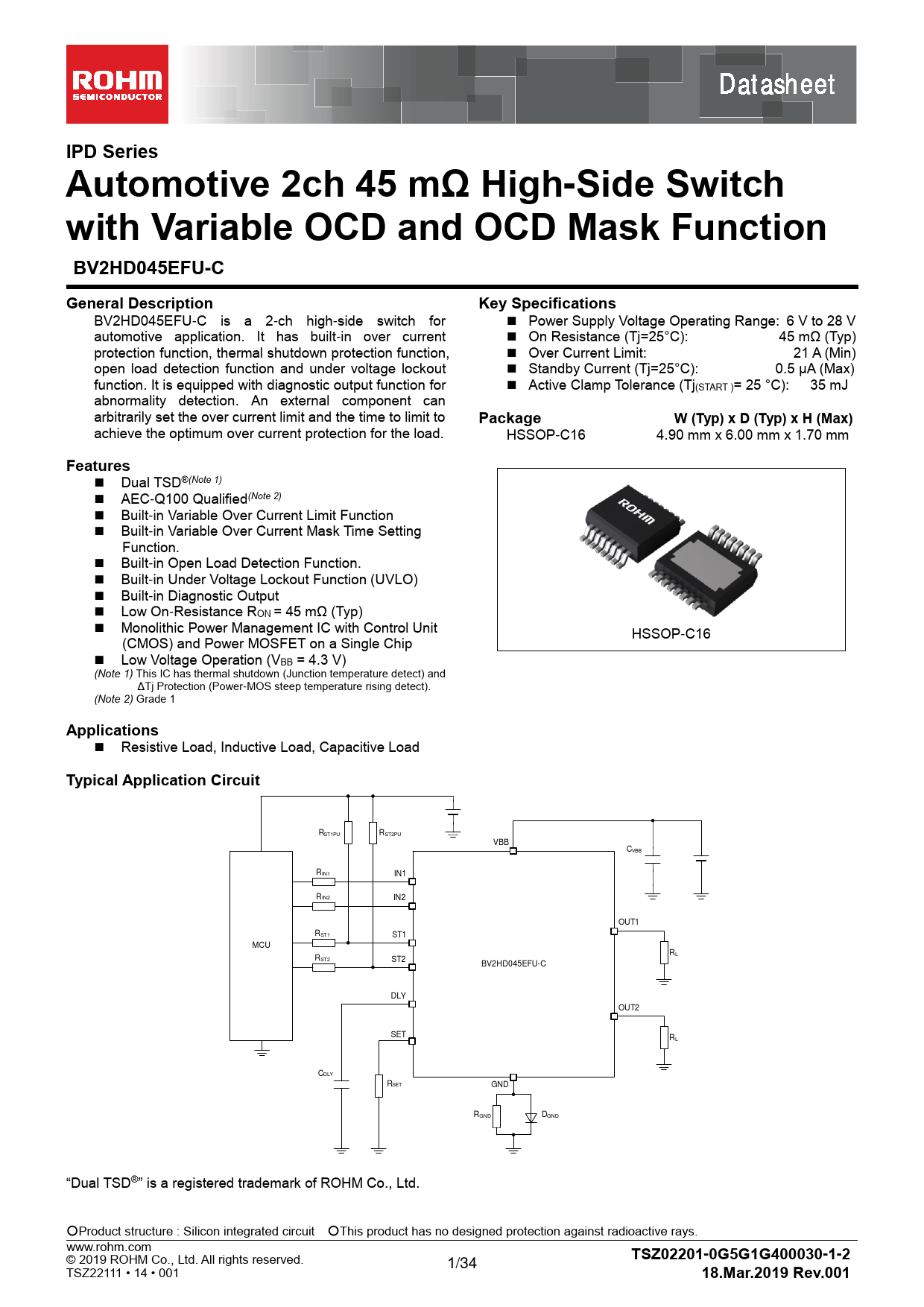 D Series Au. tomotive 2ch 45 mΩ. High-Side Switch. with Variable OCD and OCD. Mask Function. BV2HD045EFU-C. General Description