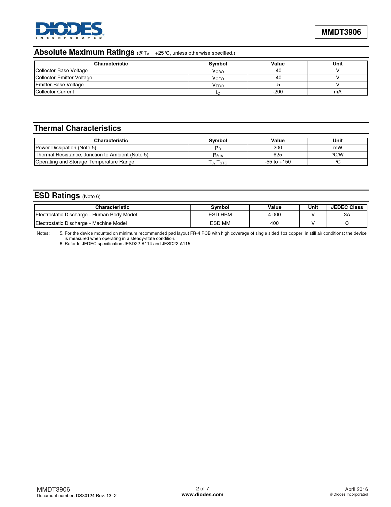 Electrostatic Discharge - Human Body Model ESD HBM 4,000 V 3A Electrostatic Discharge - Machine Model ESD MM 400 V C Notes: 5. For the device mounted on minimum recommended pad layout FR-4 PCB with high coverage of single sided 1oz copper, in still air conditions; the device is measured when operating in a steady-state condition. 6. Refer to JEDEC specification JESD22-A114 and JESD22-A115. MMDT3906 2 of 7 April 2016 Document number: DS30124 Rev. 13- 2