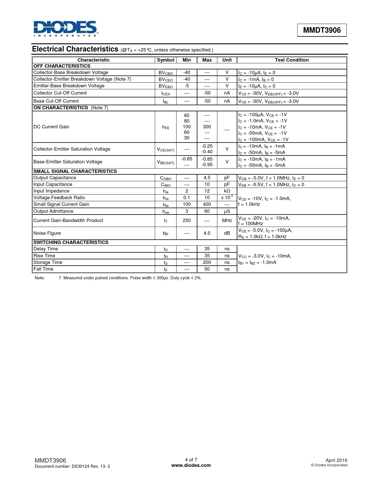 | Seiten / Seite | 7 / 4 — MMDT3906. Electrical Characteristics. Characteristic. Symbol. Min. Max. … |