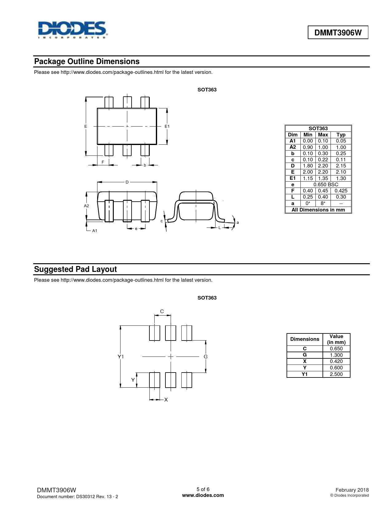 DMMT3906W. Package Outline Dimensions. SOT363. Dim Min Max. Typ. All Dimensions in mm. Suggested Pad Layout. Value. Dimensions. (in mm)