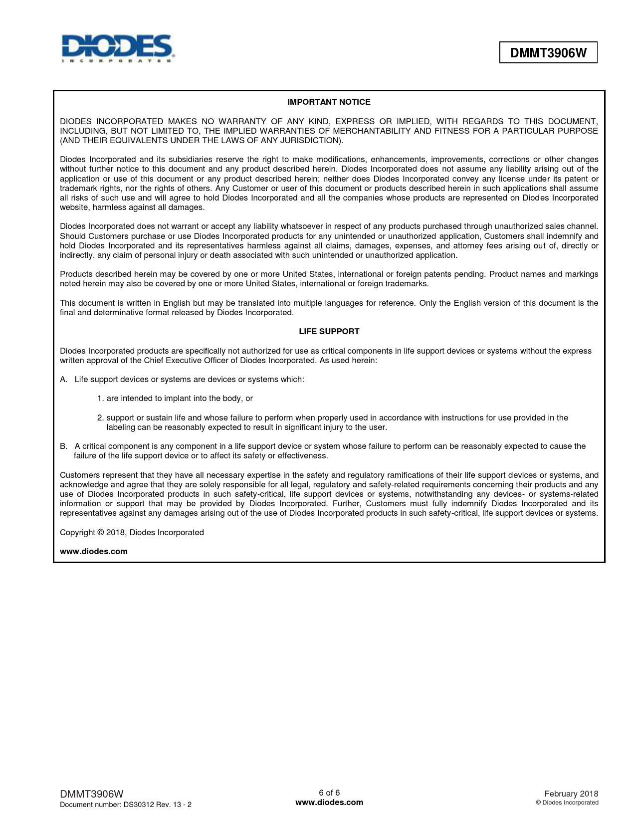 | Seiten / Seite | 6 / 6 — DMMT3906W. IMPORTANT NOTICE. LIFE SUPPORT. www.diodes.com |