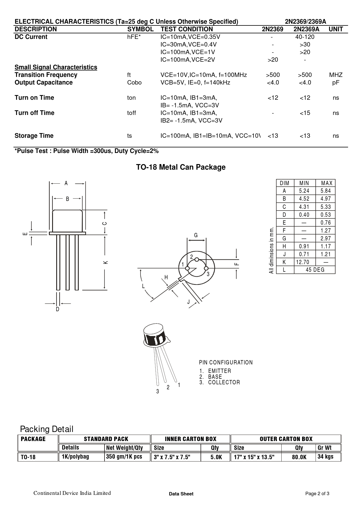 ELECTRICAL CHARACTERISTICS (Ta=25 deg C Unless Otherwise Specified)2N2369/2369ADESCRIPTIONSYMBOLTEST CONDITION2N2369 2N2369AUNITDC Current hFE* IC=10mA,VCE=0.35V - 40-120 IC=30mA,VCE=0.4V - >30 IC=100mA,VCE=1V - >20 IC=100mA,VCE=2V >20 - Small Signal Characteristics Transition Frequency ft VCE=10V,IC=10mA, f=100MHz >500 >500 MHZ Output Capacitance Cobo VCB=5V, IE=0, f=140kHz <4.0 <4.0 pF Turn on Time ton IC=10mA, IB1=3mA, <12 <12 ns IB= -1.5mA, VCC=3V Turn off Time toff IC=10mA, IB1=3mA, - <15 ns IB2= -1.5mA, VCC=3V Storage Time ts IC=100mA, IB1=IB=10mA, VCC=10V <13 <13 ns *Pulse Test : Pulse Width =300us, Duty Cycle=2%TO-18 Metal Can Package A DIM M IN M A X A 5.24 5.84 B B 4.52 4.97 C 4.31 5.33 D 0.40 0.53 C E — 0.76 . m F — 1.27 E G m G — 2.97 in H 0.91 1.17 ions J 0.71 1.21 2 ins K 1 F K 12.70 — ll dim L 45 DE G 3 A H L J D PIN CONFIGURATION 1. EM ITTER 2. BASE 3. COLLECTOR 1 2 3 Packing DetailPACKAGESTANDARD PACKINNER CARTON BOXOUTER CARTON BOXDetailsNet Weight/QtySizeQtySizeQtyGr WtTO-181K/polybag350 gm/1K pcs3" x 7.5" x 7.5"5.0K17" x 15" x 13.5"80.0K34 kgs Continental Device India Limited Data Sheet Page 2 of 3