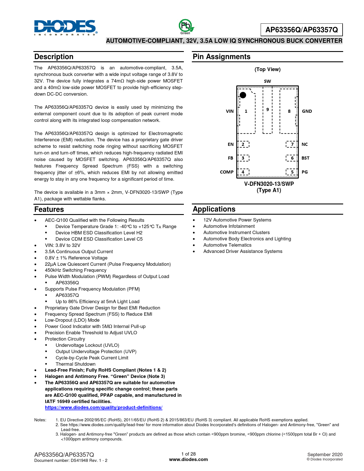Lead-Free Finish; Fully RoHS Compliant (Notes 1 & 2) Halogen and Antimony Free. “Green” Device (Note 3) The AP63356Q and AP63357Q are suitable for automotive applications requiring specific change control; these parts are AEC-Q100 qualified, PPAP capable, and manufactured in IATF 16949 certified facilities. https://www.diodes.com/quality/product-definitions/