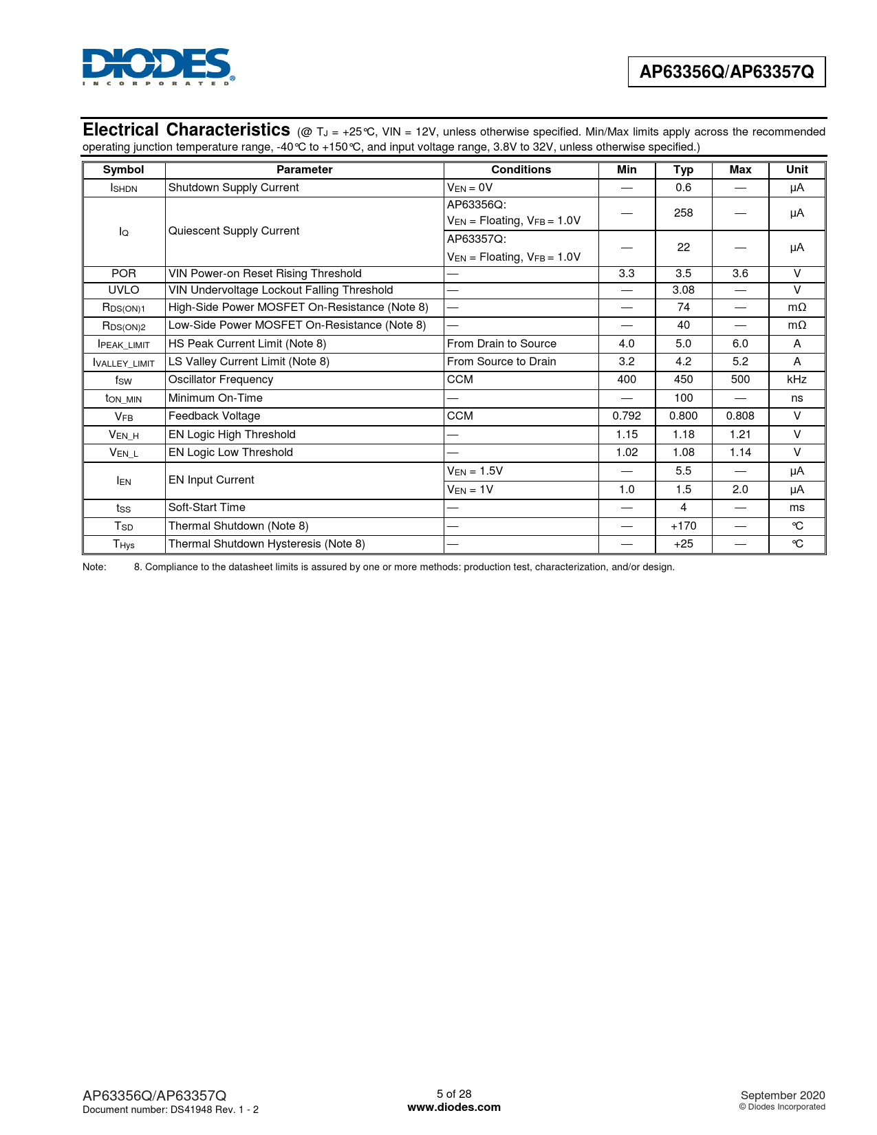 AP63356Q/AP63357Q. Electrical Characteristics. Symbol. Parameter. Conditions. Min. Typ. Max. Unit. www.diodes.com