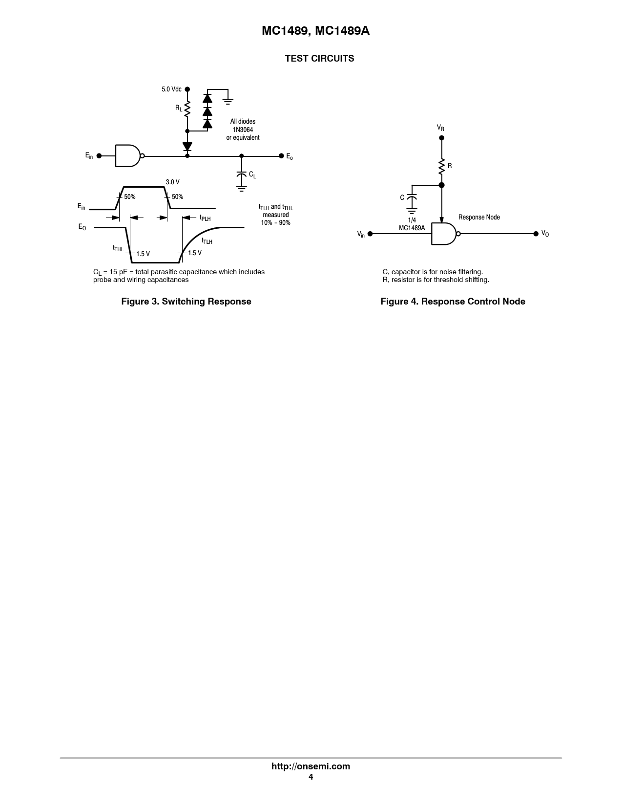 MC1489, MC1489ATEST CIRCUITS 5.0 Vdc RL All diodes V 1N3064 R or equivalent Ein Eo R CL 3.0 V 50% 50% C Ein tTLH and tTHL measured tPLH Response Node 10% - 90% 1/4 EO MC1489A V V in O tTLH tTHL 1.5 V 1.5 V CL = 15 pF = total parasitic capacitance which includes C, capacitor is for noise filtering. probe and wiring capacitances R, resistor is for threshold shifting. Figure 3. Switching ResponseFigure 4. Response Control Nodehttp://onsemi.com4