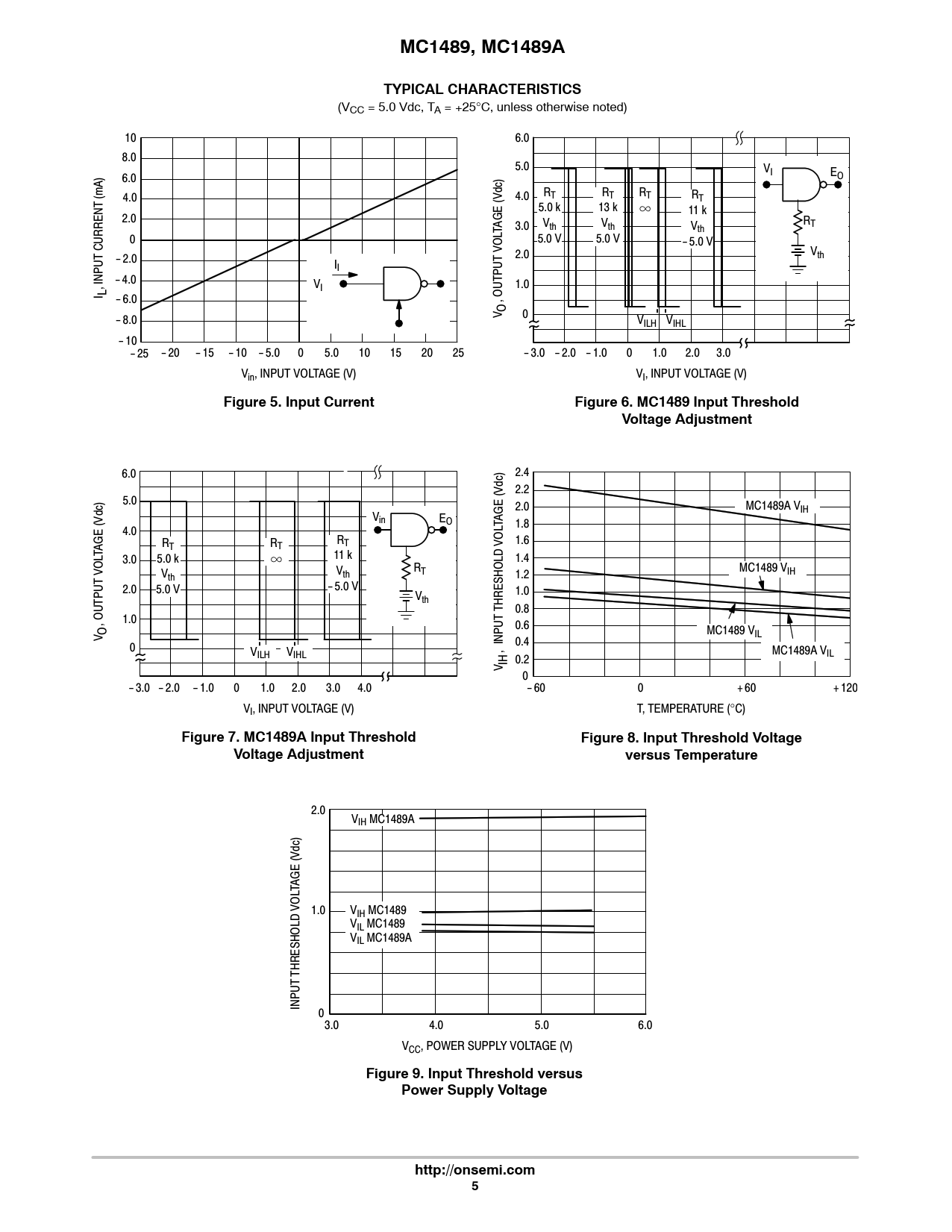 MC1489, MC1489ATYPICAL CHARACTERISTICS (VCC = 5.0 Vdc, TA = +25°C, unless otherwise noted) 10 6.0 8.0 5.0 VI E 6.0 O (mA) 4.0 R R R 4.0 T T T RT 5.0 k 13 k 1 11 k 2.0 V R 3.0 th Vth TAGE (Vdc) T Vth 0 5.0 V 5.0 V -5.0 V CURRENT VOL V -2.0 2.0 th II -4.0 VI 1.0 I , INPUT L -6.0 OV , OUTPUT 0 -8.0 VILH VIHL -10 -25 -20 -15 -10 -5.0 0 5.0 10 15 20 25 -3.0 -2.0 -1.0 0 1.0 2.0 3.0 Vin, INPUT VOLTAGE (V) VI, INPUT VOLTAGE (V) Figure 5. Input CurrentFigure 6. MC1489 Input ThresholdVoltage Adjustment 6.0 2.4 2.2 5.0 2.0 MC1489A VIH Vin EO TAGE (Vdc) 1.8 4.0 R R R 1.6 T T T TAGE (Vdc) 3.0 5.0 k 1 11 k 1.4 R MC1489 V VOL V V T IH th th 1.2 2.0 5.0 V -5.0 V 1.0 Vth THRESHOLD VOL 0.8 1.0 0.6 O MC1489 V V , OUTPUT IL 0.4 0 V V MC1489A V ILH IHL IL IH 0.2 V , INPUT 0 -3.0 -2.0 -1.0 0 1.0 2.0 3.0 4.0 -60 0 +60 +120 VI, INPUT VOLTAGE (V) T, TEMPERATURE (°C) Figure 7. MC1489A Input ThresholdFigure 8. Input Threshold VoltageVoltage Adjustmentversus Temperature 2.0 VIH MC1489A (Vdc) TAGE VOL 1.0 VIH MC1489 VIL MC1489 VIL MC1489A THRESHOLD INPUT 0 3.0 4.0 5.0 6.0 VCC, POWER SUPPLY VOLTAGE (V) Figure 9. Input Threshold versusPower Supply Voltagehttp://onsemi.com5