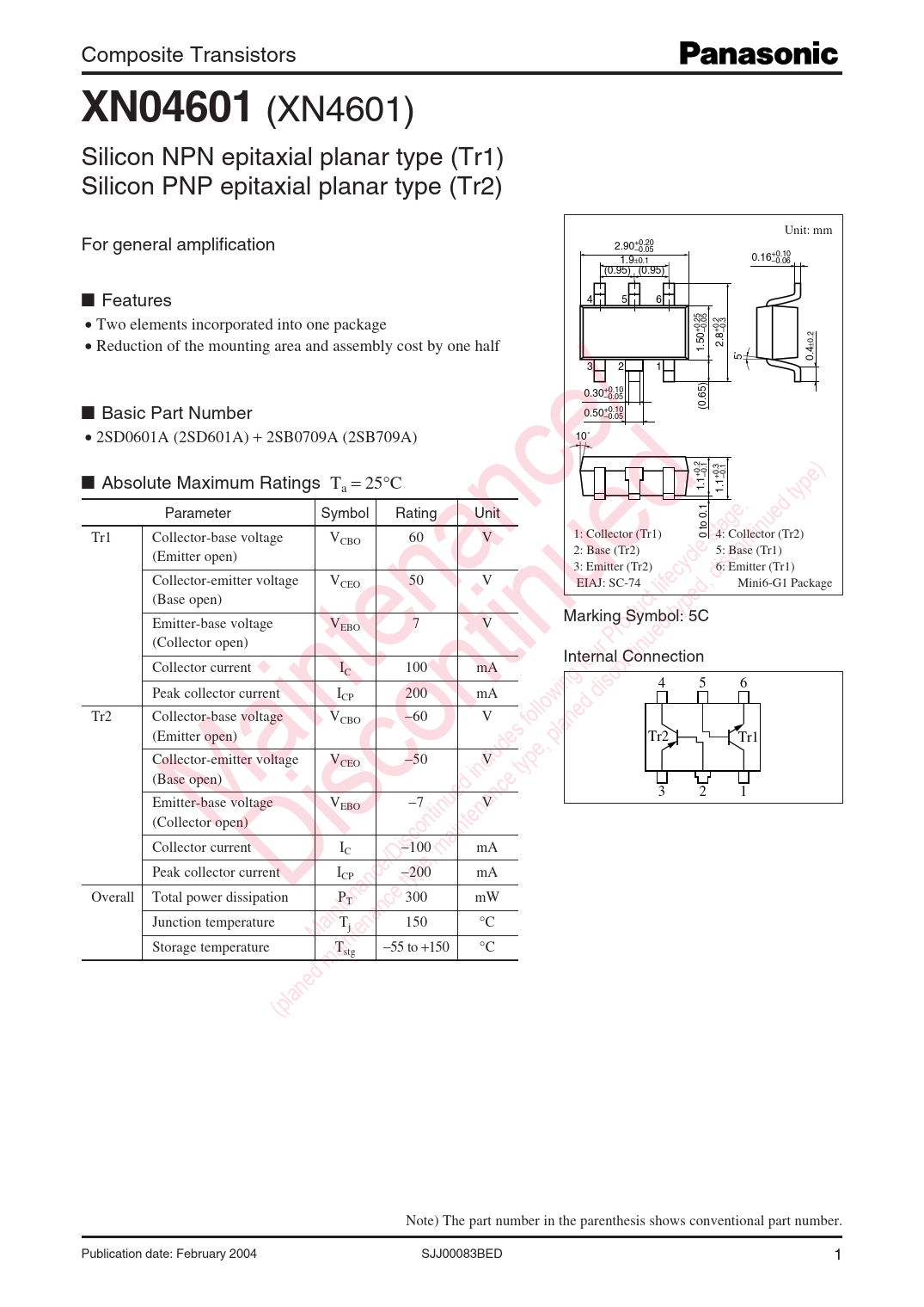 Composite Transistors XN04601 (XN4601) Silicon NPN epitaxial planar type (Tr1) Silicon PNP epitaxial planar type (Tr2) Unit: mm For general amplification 2.90+0.20 –0.05 1.9±0.1 0.16+0.10 –0.06 (0.95) (0.95) ■ Features 4 5 6 • Two elements incorporated into one package +0.25 –0.05 +0.2 –0.3 • Reduction of the mounting area and assembly cost by one half 2.8 ±0.2 1.50 5˚ 0.4 3 2 1 0.30+0.10 –0.05 ■ Basic Part Number (0.65) 0.50+0.10 –0.05 • 2SD0601A (2SD601A) + 2SB0709A (2SB709A) 10˚ ■ +0.2 –0.1 Absolute Maximum Ratings T +0.3 –0.1 a = 25°C 1.1 1.1 Parameter Symbol Rating Unit Tr1 Collector-base voltage V 1: Collector (Tr1) 0 to 0.1 4: Collector (Tr2) CBO 60 V (Emitter open) 2: Base (Tr2) 5: Base (Tr1) 3: Emitter (Tr2) 6: Emitter (Tr1) Collector-emitter voltage VCEO 50 V EIAJ: SC-74 Mini6-G1 Package (Base open) Marking Symbol: 5C Emitter-base voltage VEBO 7 V (Collector open) Internal Connection Collector current IC 100 mA 4 5 6 Peak collector current ICP 200 mA Tr2 Collector-base voltage V − CBO 60 V (Emitter open) Tr2 Tr1 Collector-emitter voltage V − CEO 50 V (Base open) 3 2 1 Maintenance/ Emitter-base voltage V − EBO 7 V (Collector open) Collector current I − C 100 mA Discontinued Peak collector current I − CP 200 mA Overall Total power dissipation PT 300 mW Junction temperature Tj 150 °C Maintenance/Discontinued includes following four Product lifecycle stage. Storage temperature T − stg 55 to +150 °C (planed maintenance type, maintenance type, planed discontinued typed, discontinued type) Note) The part number in the parenthesis shows conventional part number. Publication date: February 2004 SJJ00083BED 1