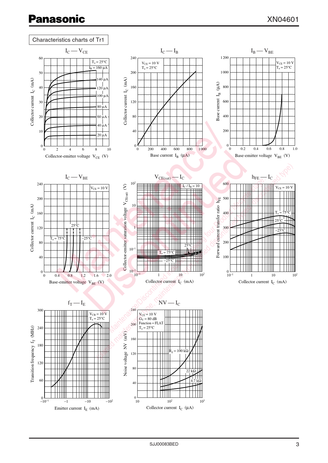 XN04601 Characteristics charts of Tr1 IC VCE IC IB IB VBE 60 240 1 200 Ta = 25°C V V CE = 10 V CE = 10 V I T B = 160 µA Ta = 25°C a = 25°C 50 200 1 000 ) 140 µA ) (mA (mA 40 120 µA 160 800 (µA C C B 100 µA 30 120 600 80 µA 20 60 µA 80 400 Base current I Collector current I 40 µA Collector current I 10 40 200 20 µA 0 0 0 0 2 4 6 8 10 0 200 400 600 800 1 000 0 0.2 0.4 0.6 0.8 1.0 Collector-emitter voltage V (V) Base current I (µA) Base-emitter voltage V (V) CE B BE IC VBE VCE(sat) IC hFE IC 240 ) 102 600 I V C / IB = 10 V CE = 10 V (V CE = 10 V 200 500 CE(sat) FE ) 10 (mA 160 400 Ta = 75°C C 25°C 25°C 120 1 300 −25°C Ta = 75°C −25°C 80 200 25°C Collector current I 10−1 Ta = 75°C 40 Forward current transfer ratio h 100 −25°C Collector-emitter saturation voltage V 0 10−2 0 0 0.4 0.8 1.2 1.6 2.0 10−1 1 10 102 10−1 1 10 102 Base-emitter voltage V (V) Collector current I (mA) Collector current I (mA) Maintenance/ BE C C f Discontinued T IE NV IC 300 240 VCB = 10 V VCE = 10 V Ta = 25°C GV = 80 dB Function = FLAT ) 200 240 Ta = 25°C ) Maintenance/Discontinued includes following four Product lifecycle stage. (MHz (mV 160 T 180 Rg = 100 kΩ 120 (planed maintenance type, maintenance type, planed discontinued typed, discontinued type) 120 80 22 kΩ Noise voltage NV 60 Transition frequency f 4.7 kΩ 40 0 0 −10−1 −1 −10 −102 10 102 103 Emitter current I (mA) Collector current I (µA) E C SJJ00083BED 3