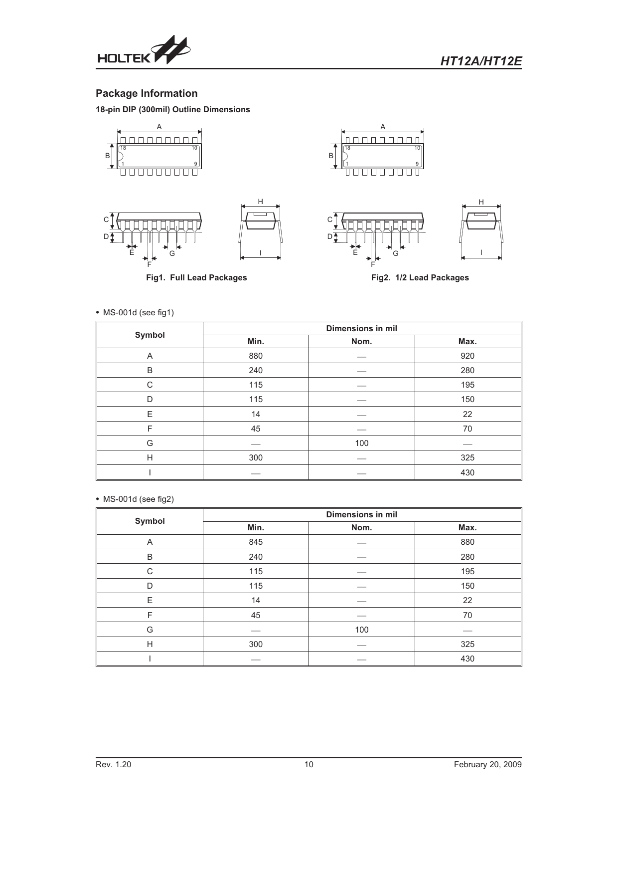 HT12A/HT12E. Package Information. 18-pin DIP (300mil) Outline Dimensions. Fig1. Full Lead Packages. Fig2. 1/2 Lead Packages