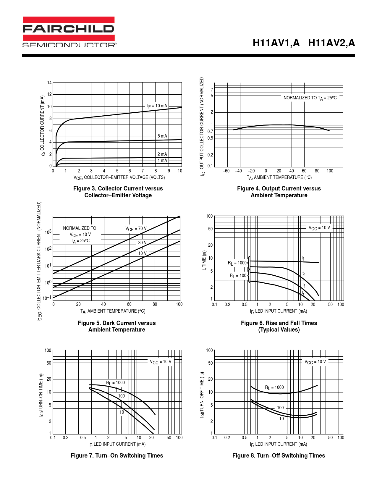 H11AV1,A H11AV2,A 14 7 12 5 NORMALIZED TO TA = 25°C (mA) 10 (NORMALIZED) IF = 10 mA 2 8 1 I OR CURRENT 6 OR CURRENT 0.7 5 mA 0.5 4 , COLLECT COLLECT C 2 2 mA 0.2 1 mA 0 0.1 0 1 2 3 4 5 6 7 8 9 10 , OUTPUT –60 –40 –20 0 20 40 60 80 100 CI VCE, COLLECTOR–EMITTER VOLTAGE (VOLTS) TA, AMBIENT TEMPERATURE (°C) Figure 3. Collector Current versusFigure 4. Output Current versusCollector–Emitter VoltageAmbient Temperature 100 V (NORMALIZED) NORMALIZED TO: VCE = 70 V 50 CC = 10 V 103 VCE = 10 V TA = 25°C 30 V 20 102 10 V s)µ 10 tf R { 101 TIME ( L = 1000 t, 5 tr RL = 100 { 100 tf OR–EMITTER DARK CURRENT 2 tr 10–1 1 0 20 40 60 80 100 0.1 0.2 0.5 1 2 5 10 20 50 100 , COLLECT TA, AMBIENT TEMPERATURE (°C) IF, LED INPUT CURRENT (mA) I CEO Figure 5. Dark Current versusFigure 6. Rise and Fall TimesAmbient Temperature(Typical Values) 100 100 50 VCC = 10 V 50 VCC = 10 V s)µ s)µ 20 20 RL = 1000 TIME ( TIME ( RL = 1000 10 10 100 5 5 100 , TURN–ON 10 , TURN–OFF f t on t of 10 2 2 1 1 0.1 0.2 0.5 1 2 5 10 20 50 100 0.1 0.2 0.5 1 2 5 10 20 50 100 IF, LED INPUT CURRENT (mA) IF, LED INPUT CURRENT (mA) Figure 7. Turn–On Switching TimesFigure 8. Turn–Off Switching Times