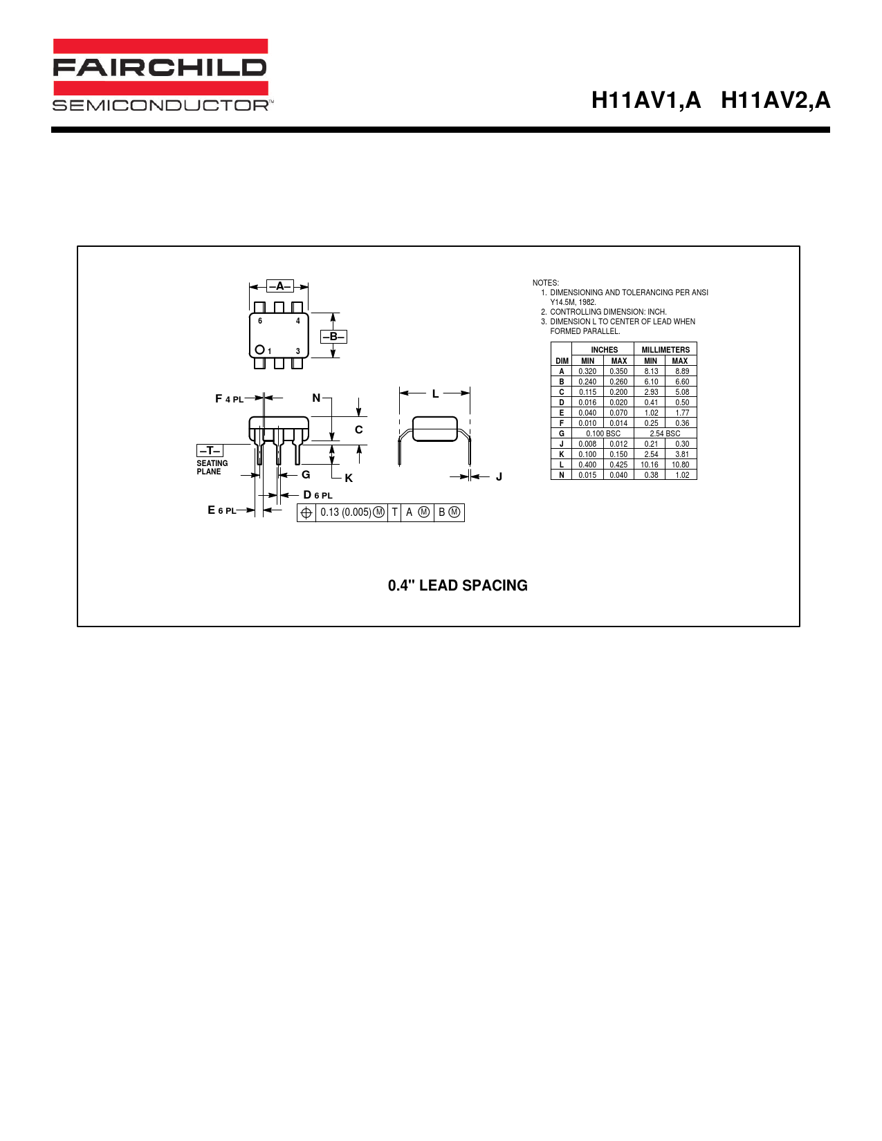 H11AV1,A H11AV2,A –A– –B– INCHES MILLIMETERS DIM MIN MAX 4 PL –T– SEATING PLANE D 6 PL E 6 PL 0.4" LEAD SPACING