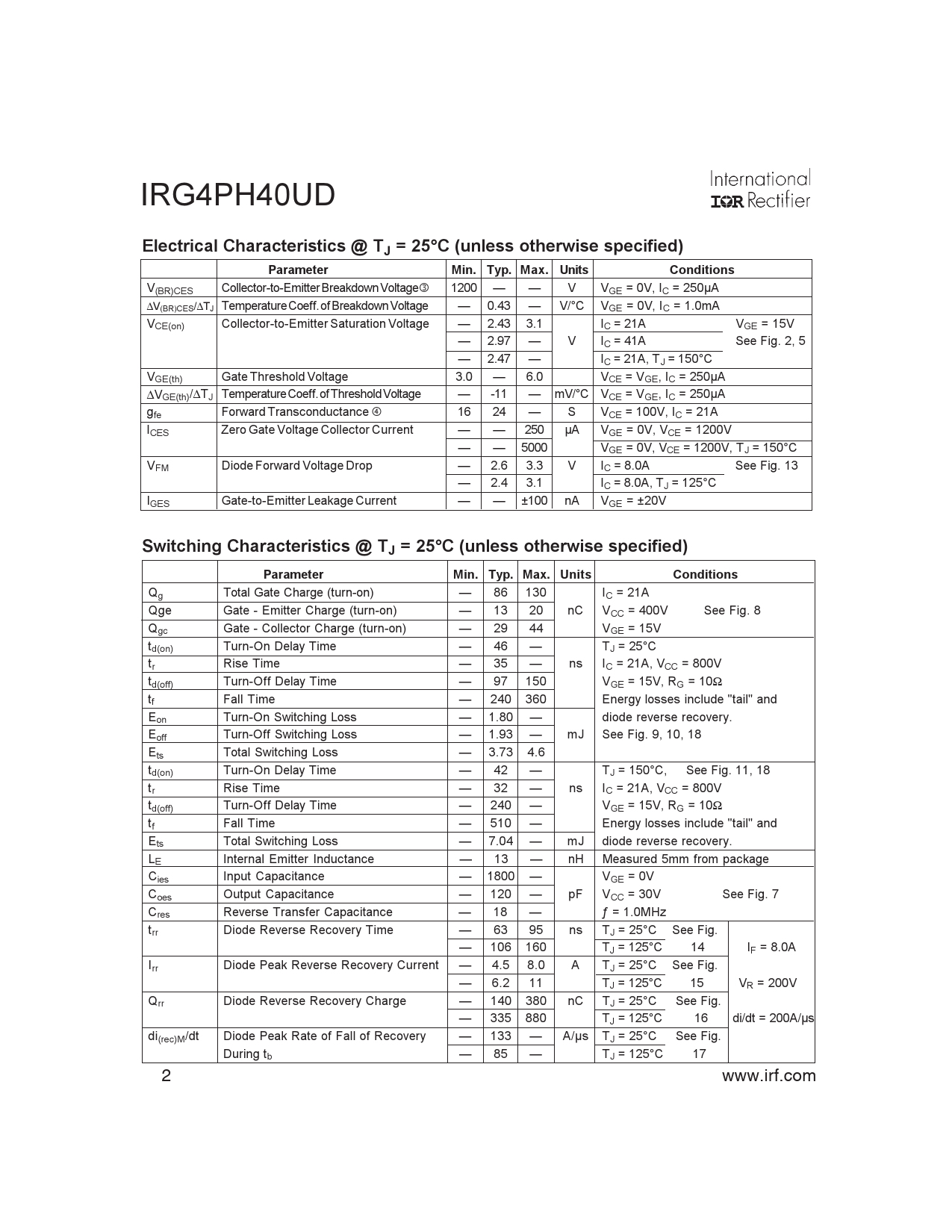V(BR)CES Collector-to-Emitter Breakdown Voltage 1200 V VGE = 0V, IC = 250µA ∆V(BR)CES/∆TJ Temperature Coeff. of Breakdown Voltage 0.43 V/°C VGE = 0V, IC = 1.0mA VCE(on) Collector-to-Emitter Saturation Voltage 2.43 3.1 IC = 21A VGE = 15V 2.97 V IC = 41A See Fig. 2, 5 2.47 IC = 21A, TJ = 150°C VGE(th) Gate Threshold Voltage 3.0 6.0 VCE = VGE, IC = 250µA ∆VGE(th)/∆TJ Temperature Coeff. of Threshold Voltage -11 mV/°C VCE = VGE, IC = 250µA gfe Forward Transconductance 16 24 S VCE = 100V, IC = 21A ICES Zero Gate Voltage Collector Current 250 µA VGE = 0V, VCE = 1200V 5000 VGE = 0V, VCE = 1200V, TJ = 150°C VFM Diode Forward Voltage Drop 2.6 3.3 V IC = 8.0A See Fig. 13 2.43.1 IC = 8.0A, TJ = 125°C IGES Gate-to-Emitter Leakage Current ±100 nA VGE = ±20V