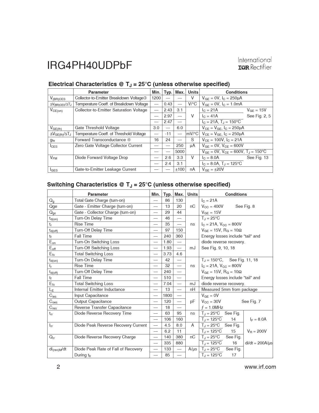 Qg Total Gate Charge (turn-on) — 86 130 IC = 21A Qge Gate - Emitter Charge (turn-on) — 13 20 nC VCC = 400V See Fig. 8 Qgc Gate - Collector Charge (turn-on) — 29 44 VGE = 15V td(on) Turn-On Delay Time — 46 — TJ = 25°C tr Rise Time — 35 — ns IC = 21A, VCC = 800V td(off) Turn-Off Delay Time — 97 150 VGE = 15V, RG = 10Ω tf Fall Time — 240 360 Energy losses include "tail" and Eon Turn-On Switching Loss — 1.80 — diode reverse recovery. Eoff Turn-Off Switching Loss — 1.93 — mJ See Fig. 9, 10, 18 Ets Total Switching Loss — 3.73 4.6 td(on) Turn-On Delay Time — 42 — TJ = 150°C, See Fig. 11, 18 tr Rise Time — 32 — ns IC = 21A, VCC = 800V td(off) Turn-Off Delay Time — 240 — VGE = 15V, RG = 10Ω tf Fall Time — 510 — Energy losses include "tail" and Ets Total Switching Loss — 7.04 — mJ diode reverse recovery. LE Internal Emitter Inductance — 13 — nH Measured 5mm from package Cies Input Capacitance — 1800 — VGE = 0V Coes Output Capacitance — 120 — pF VCC = 30V See Fig. 7 Cres Reverse Transfer Capacitance — 18 — ƒ = 1.0MHz trr Diode Reverse Recovery Time — 63 95 ns TJ = 25°C See Fig. — 106 160 TJ = 125°C 14 IF = 8.0A Irr Diode Peak Reverse Recovery Current — 4.5 8.0 A TJ = 25°C See Fig. — 6.2 11 TJ = 125°C 15 VR = 200V Qrr Diode Reverse Recovery Charge — 140 380 nC TJ = 25°C See Fig. — 335 880 TJ = 125°C 16 di/dt = 200A/µs di(rec)M/dt Diode Peak Rate of Fall of Recovery — 133 — A/µs TJ = 25°C See Fig. During tb — 85 — TJ = 125°C 17 2 www.irf.com